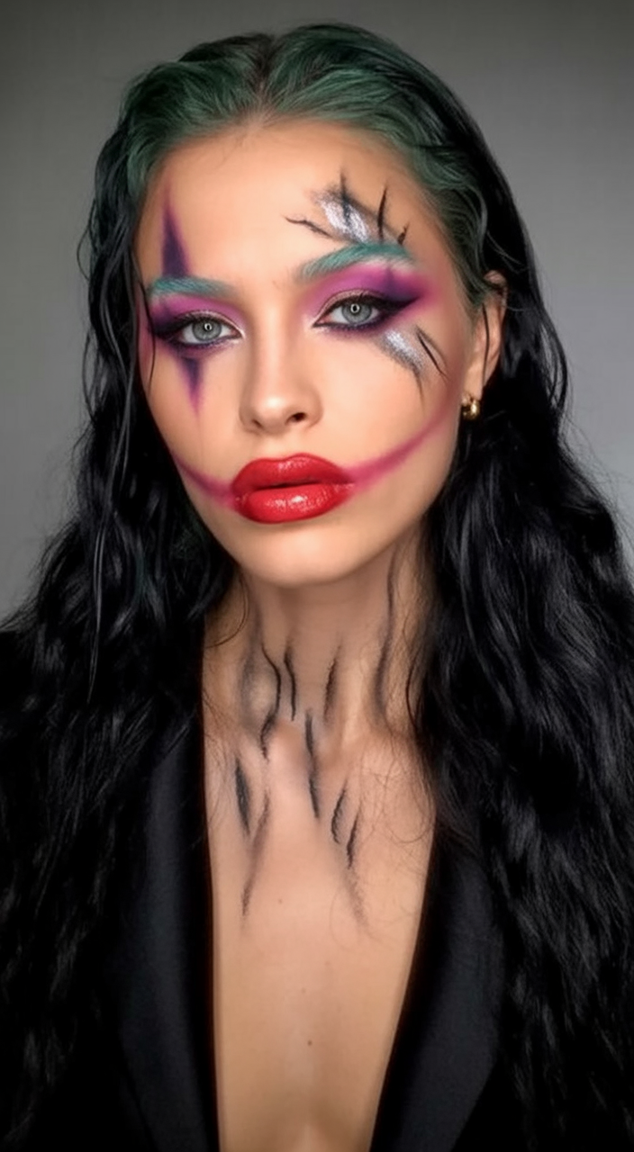 There’s something mesmerizing about this look — it blends glam and chaos into one unforgettable statement. The vivid magenta and teal eye makeup contrasts perfectly with the exaggerated red smile, evoking a hauntingly beautiful horreur effect. The black scratch-like marks crawling up the neck and face make it feel like a twisted fairytale villain come to life — bold, confident, and slightly unhinged in the best way.