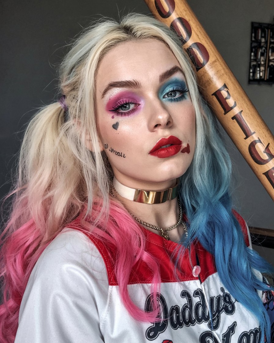 Playful, rebellious, and unapologetically chaotic — this look channels Harley Quinn energy in the most fun way. The split-tone eyeshadow in electric blue and hot pink immediately says Halloween party-ready. Paired with heart and smudge tattoos, it’s a cheeky nod to classic comic-inspired maquillage halloween 2025 that turns heads.