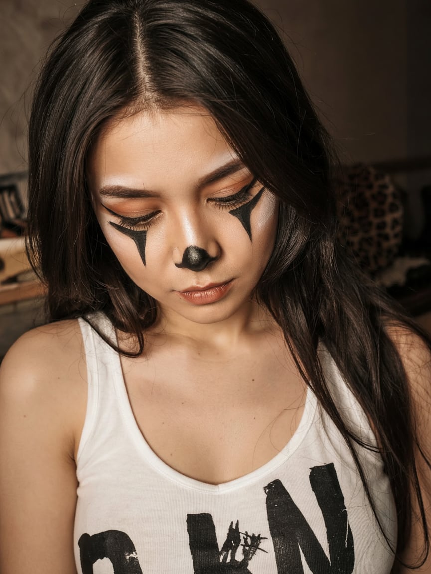 This is ideal for those who love a simple yet expressive Halloween look. It flatters most face shapes and works especially well on medium to tan complexions. Minimal makeup needed — black eyeshadow, eyeliner, and a nude or brick lipstick. It’s a perfect intro-level Halloween face that says a lot with very little.