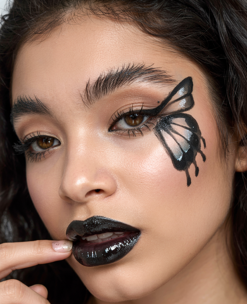 Dramatic yet soft, this black butterfly wing on the cheek has a painterly elegance that’s hard to resist. It whispers mystery and glamour at the same time. The high-gloss black lips and dewy skin turn this into a full beau editorial moment.