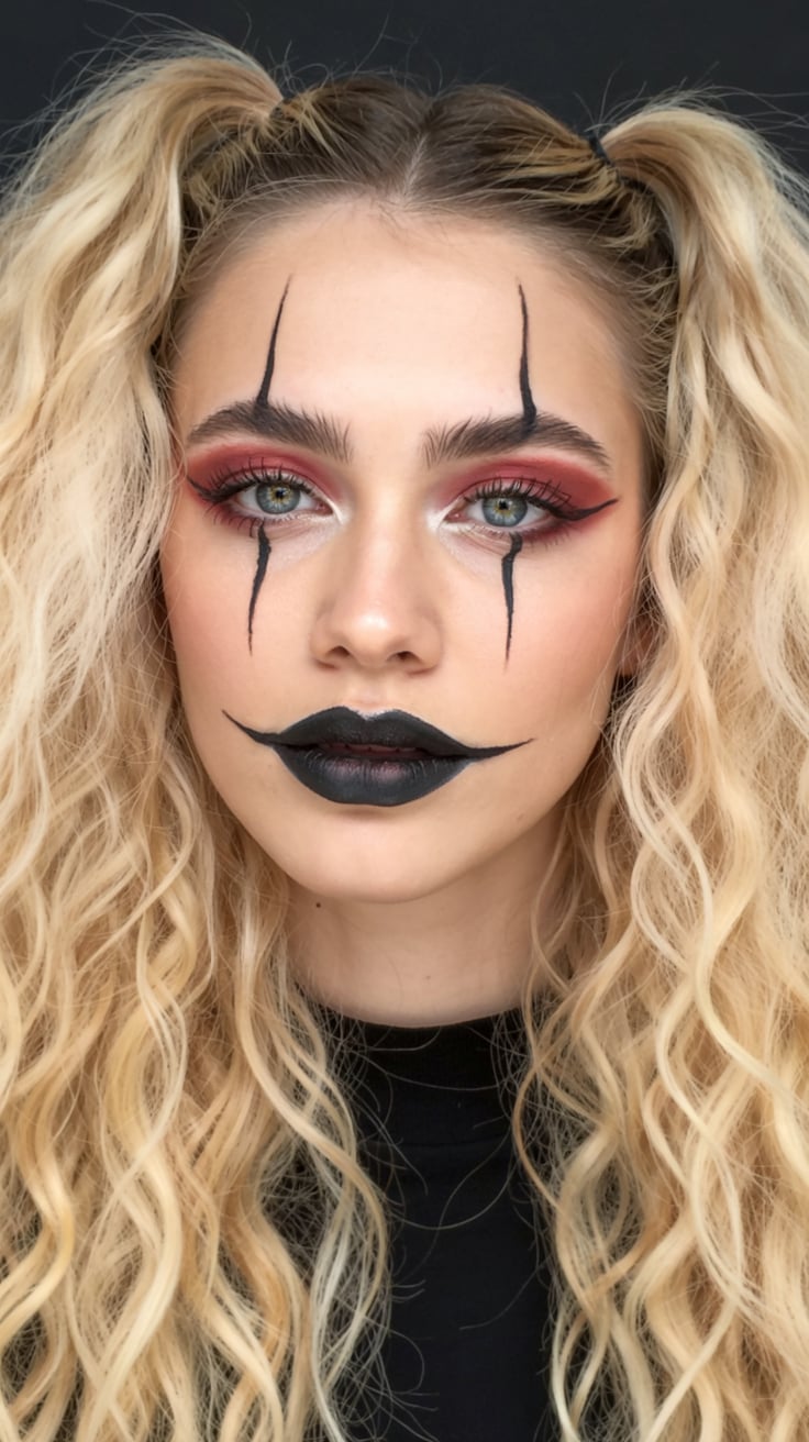 Drama, elegance, and a splash of mischief — this gothic clown look feels right out of a high-fashion editorial. The black lip and liner combination contrasts perfectly with red eyeshadow and glowing skin. It’s giving haunted doll, but make it chic.