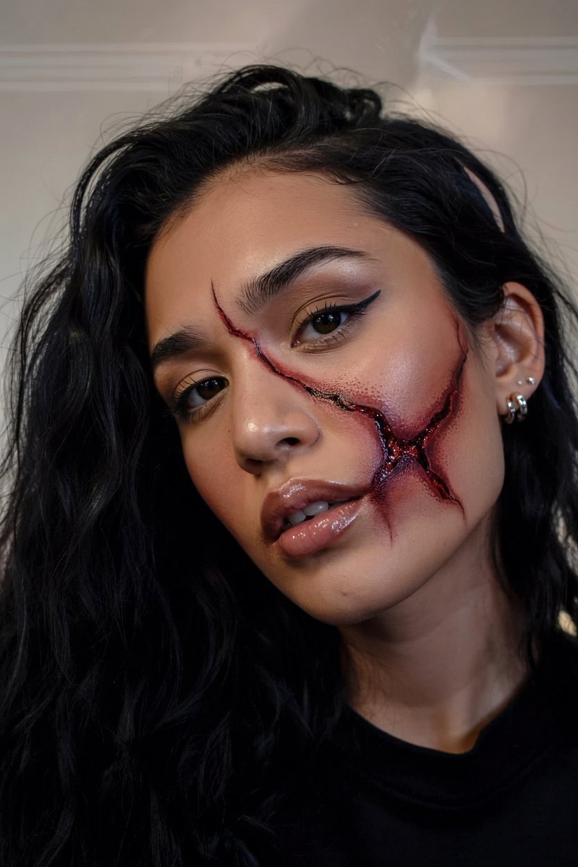 Terrifyingly realistic, this deep wound effect makeup is a Halloween showstopper. The illusion of torn flesh, highlighted with crimson and shadows, is horreur at its finest. Yet the natural base makeup keeps it grounded in glam — just the right balance of gore and beauty.