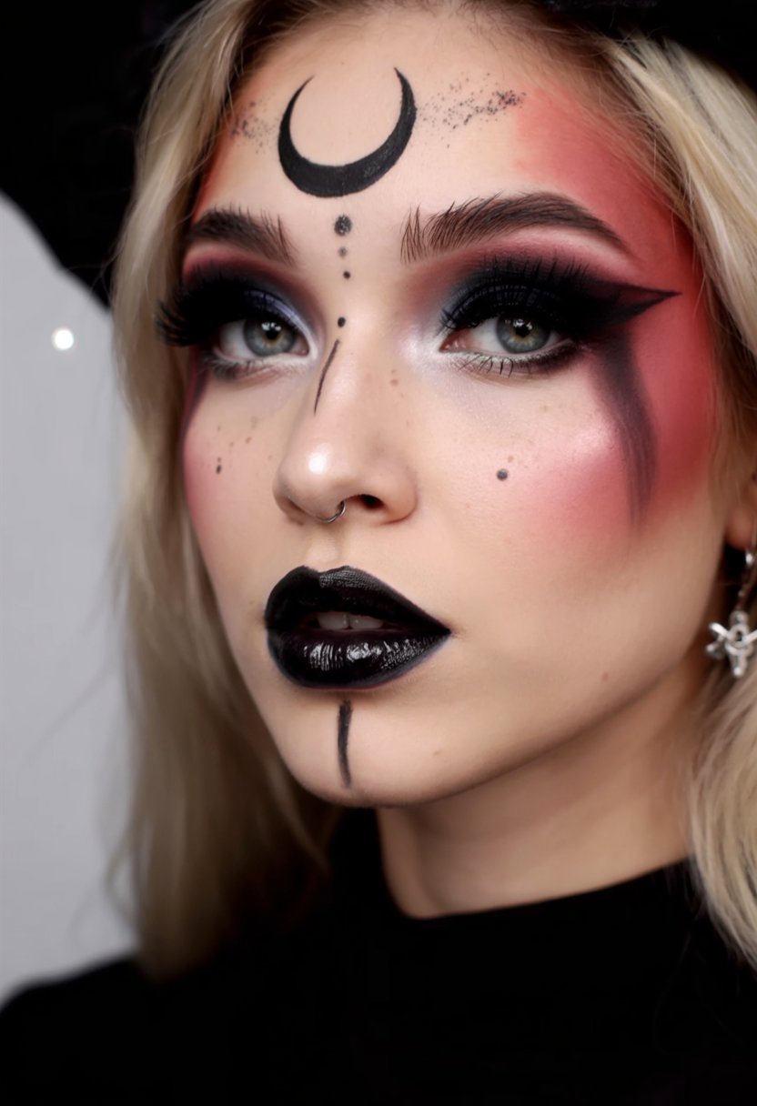 This style works well for those who want a dramatic transformation without needing prosthetics or fake blood. Ideal for women with symmetrical facial features and a steady hand, this makeup can elevate a dark outfit into a full-on Halloween vision. Add a sleek black coat or blazer to emphasize the theatrical beau shadows and contouring.