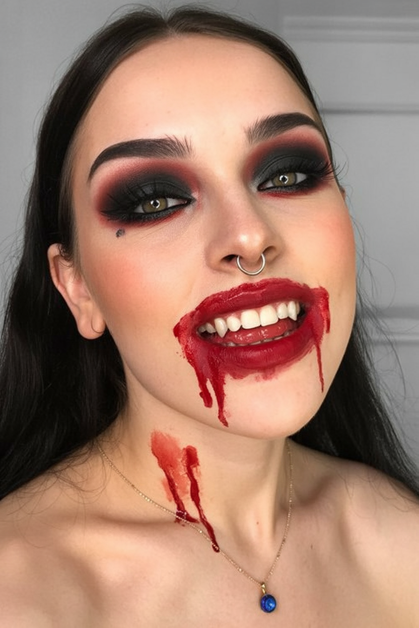 It’s dark, seductive, and just the right amount of messy — this vampire look brings high glamour with a side of fresh bite. The smoky black and red eyeshadow gives pure intensity, while the drippy blood effect around the lips adds classic Halloween horreur charm.