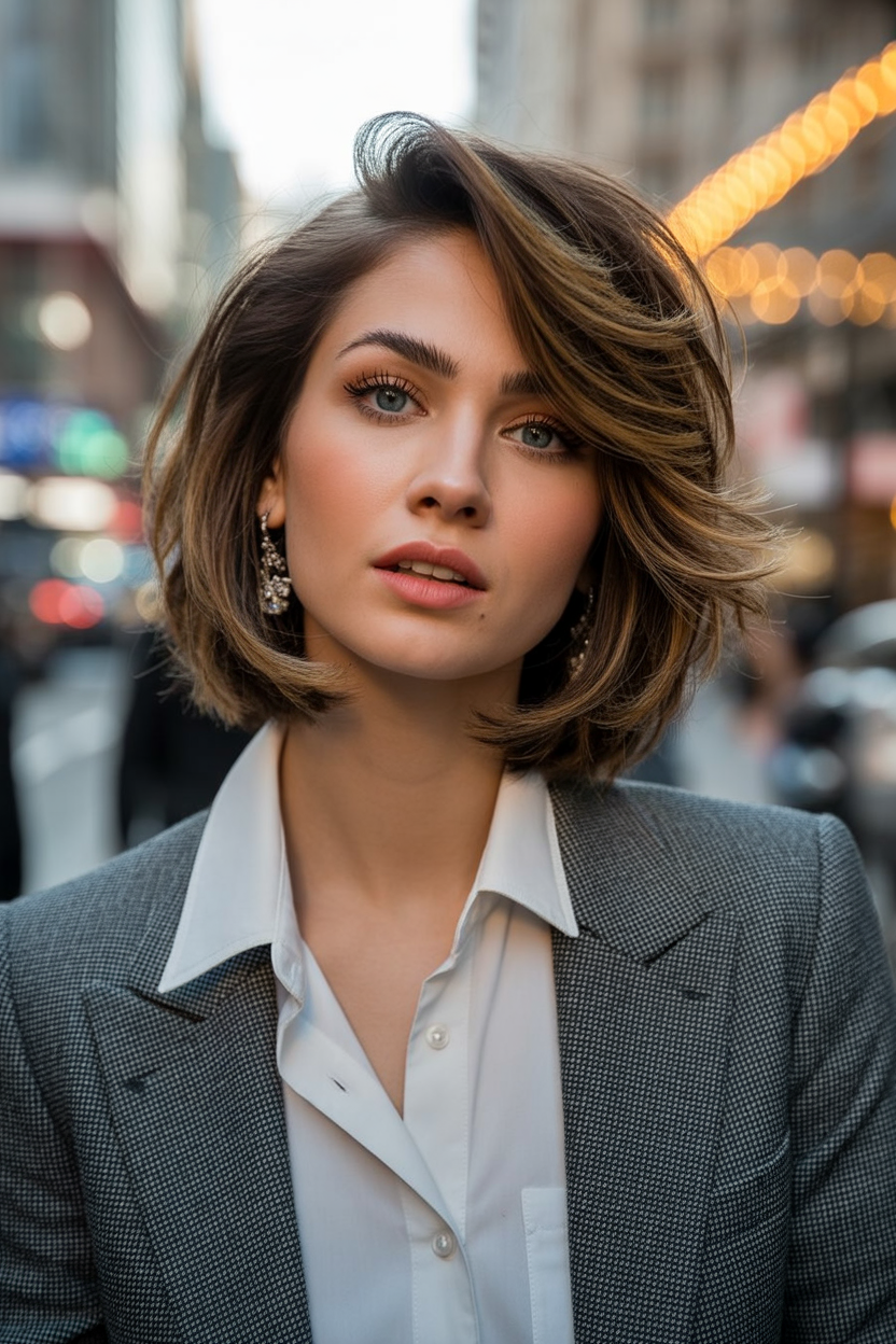 This angled bob sits at a comfortable medium length, making it a great choice for women who want something longer than a classic short cut but still manageable. It works well for wavy or slightly textured hair, and it’s especially forgiving if you like air-drying or minimal heat styling. A touch of styling cream enhances the natural flow without weighing it down.