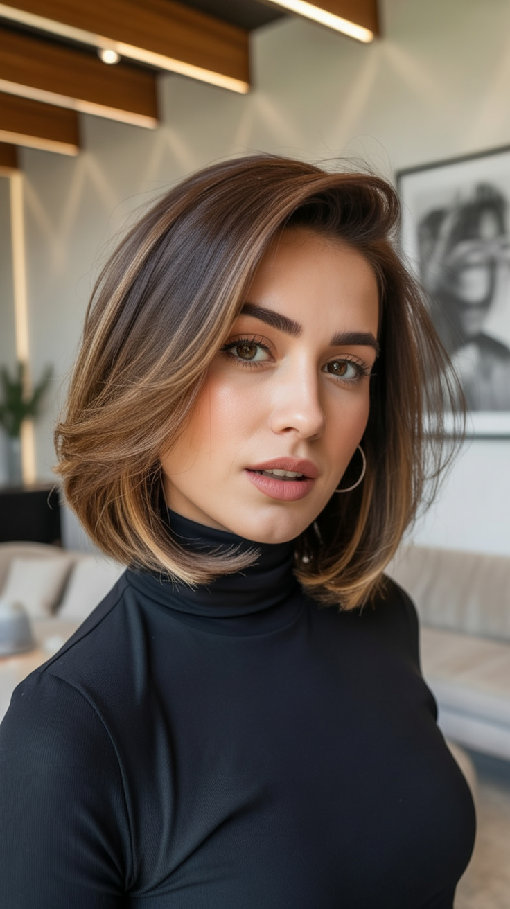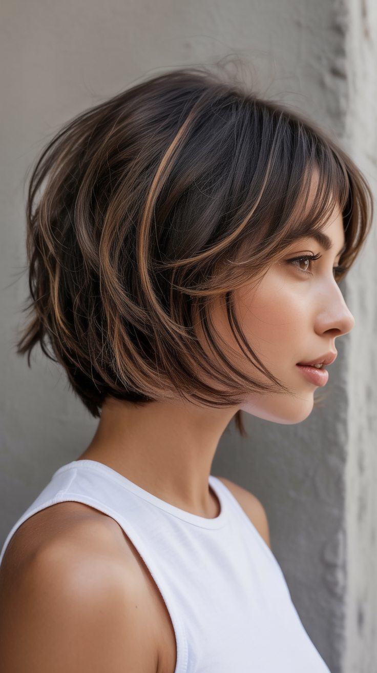 This hairstyle exudes a quiet confidence and is incredibly elegant. The neat shape offers a polished look alongside the side profile. The slight highlights add a touch of softness and depth. It’s a versatile hairstyle great for everyday wear or a special occasion.