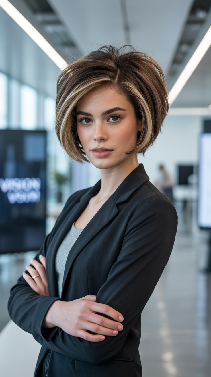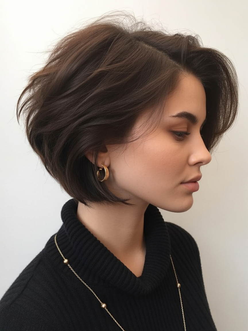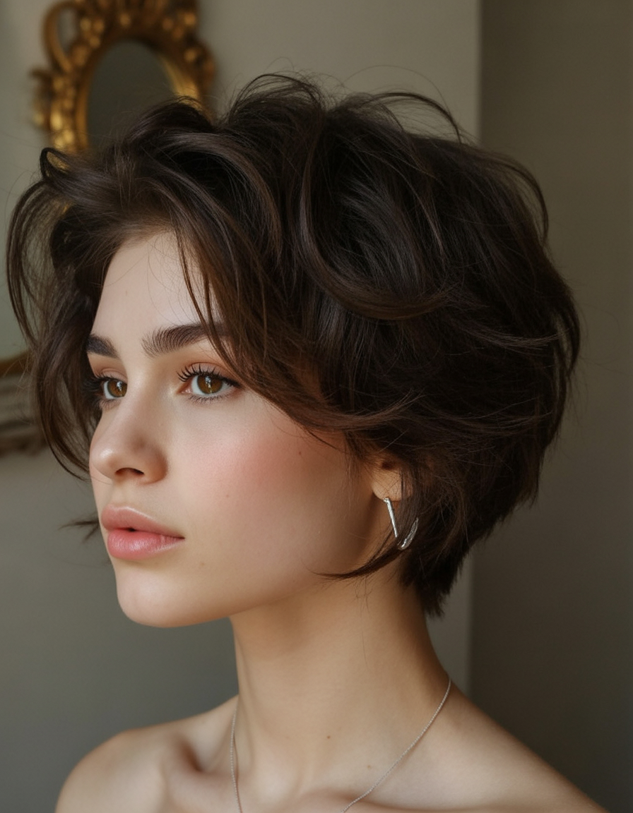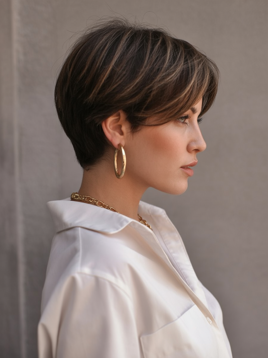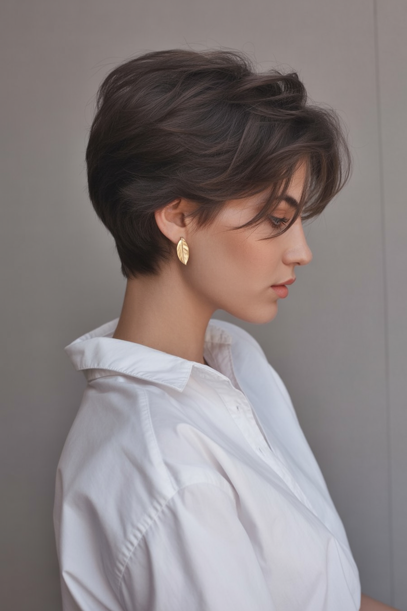 Blending pixie elements with a short stacked bob haircut, this look is ideal for women who love structure and simplicity. It works beautifully for fine hair, keeping volume concentrated at the crown without looking flat. Styling is quick and intentional—a touch of smoothing cream is usually enough for a polished finish.