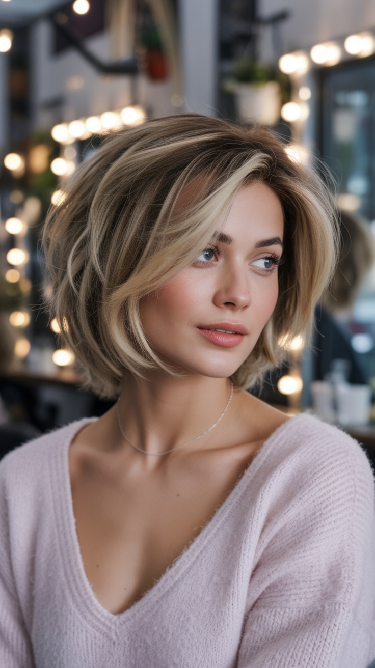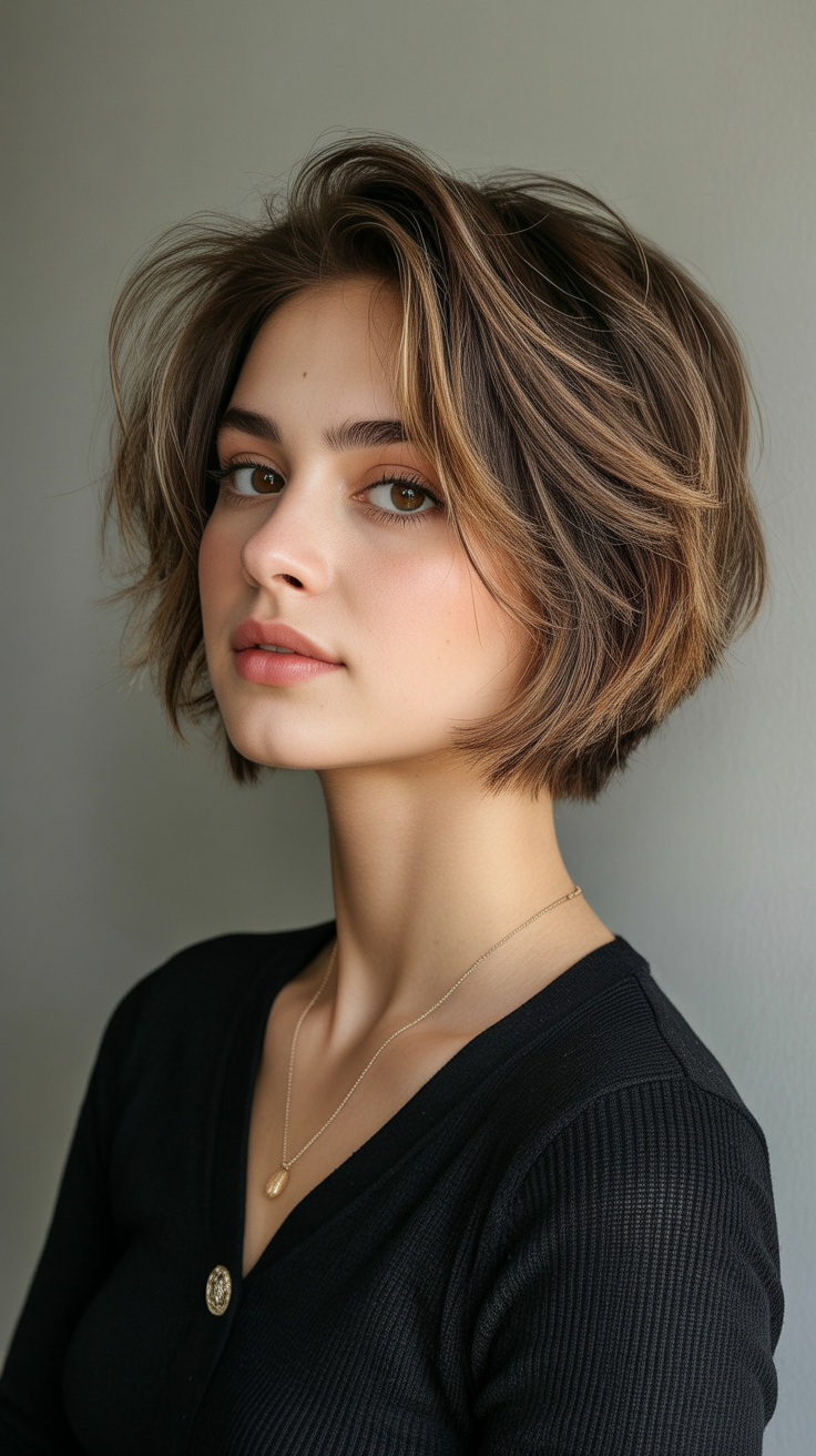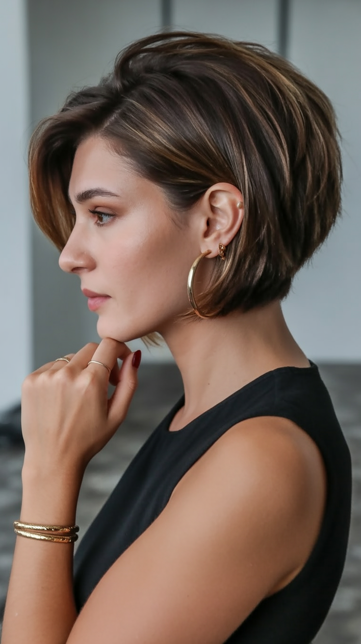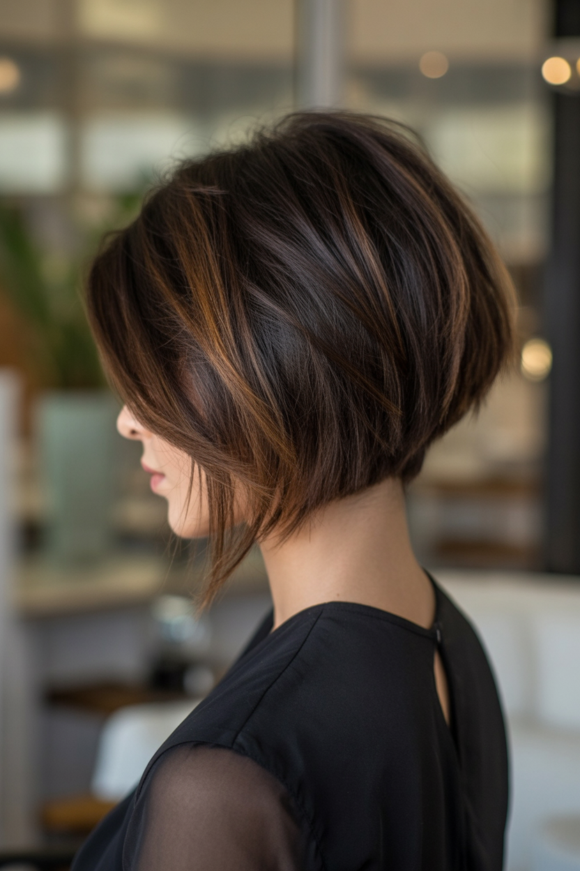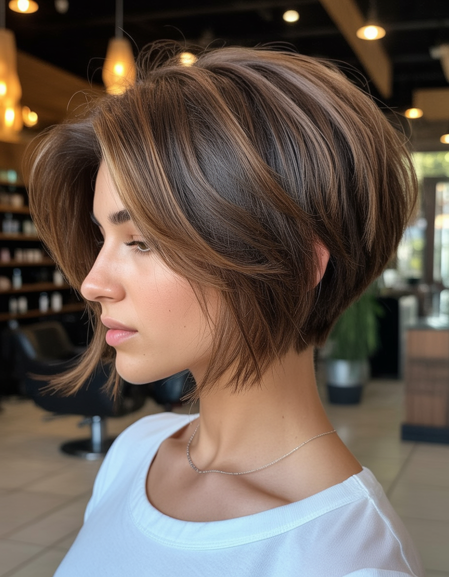 What makes this layered stacked bob haircut special is how it builds volume without looking bulky. It’s a wonderful option for women who want fullness through the crown, especially for fine hair or slightly wavy textures. A light styling cream or quick blow-dry enhances the layers and keeps the shape airy.