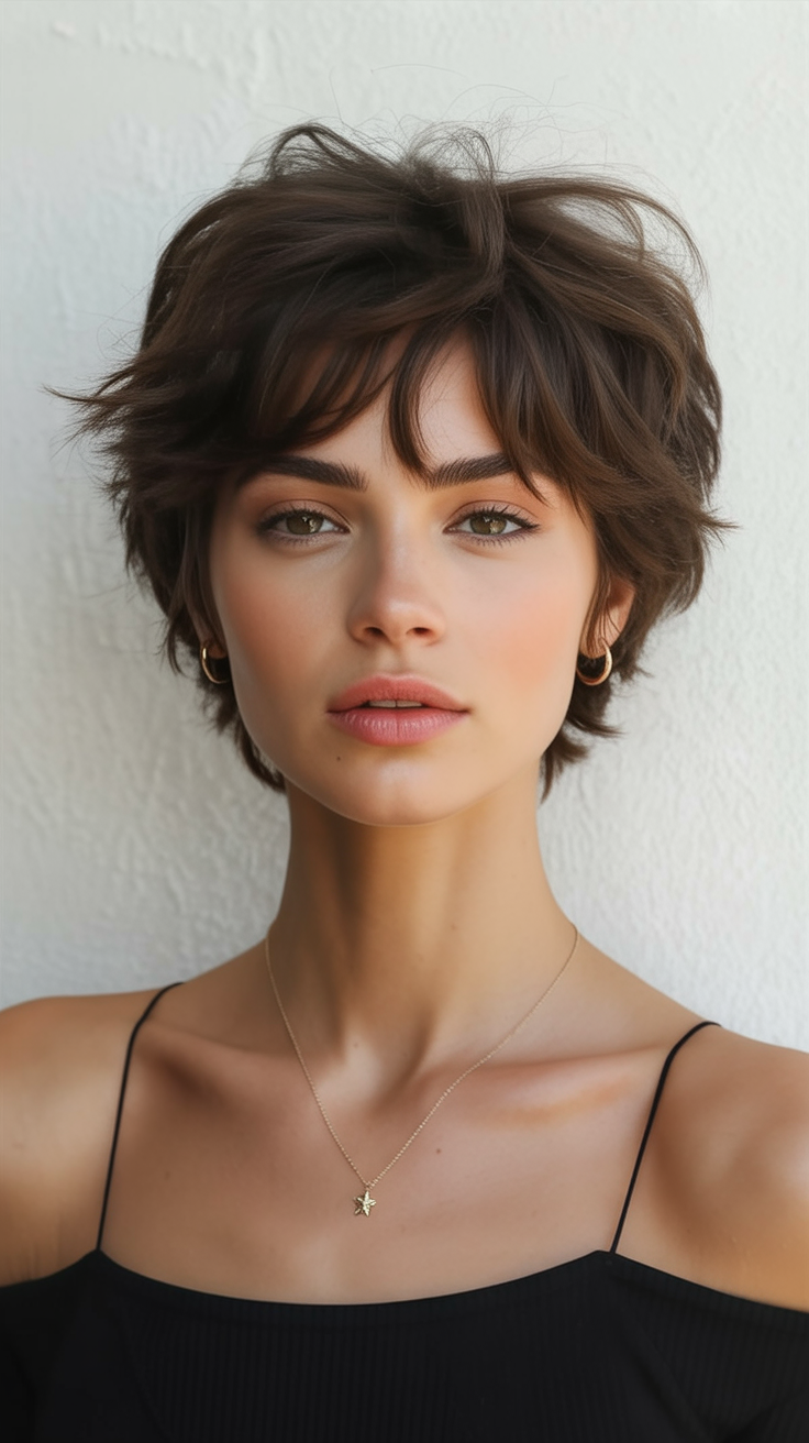 This haircut has attitude in the best possible way. It’s bold, confident, and surprisingly soft all at once. The cropped shape highlights the neck and cheekbones, while the volume at the top keeps it feminine and modern rather than severe.
