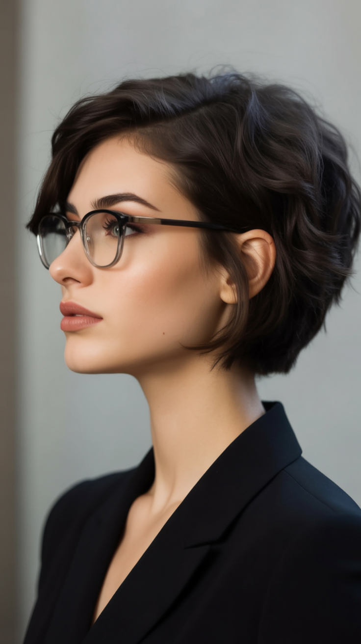 This pixie-inspired stacked bob works beautifully for curly hair, keeping the shape controlled while allowing natural texture to shine. It’s a great choice for women who wear glasses, as the cut stays light around the face. Styling is simple: a curl-enhancing product and minimal effort go a long way.