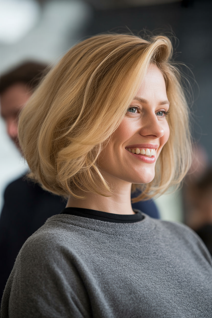 This haircut radiates warmth and approachability. The soft volume and rounded shape give it a timeless appeal that feels friendly, confident, and effortlessly flattering. It’s the kind of style that makes you look well put together without feeling overly styled.