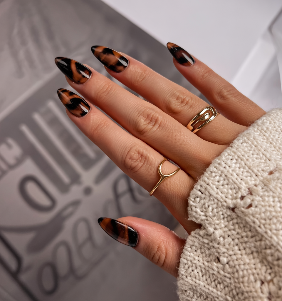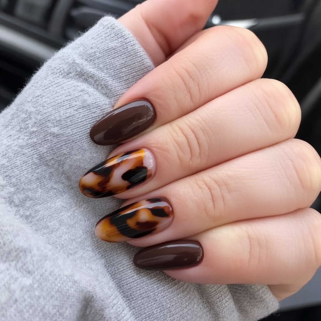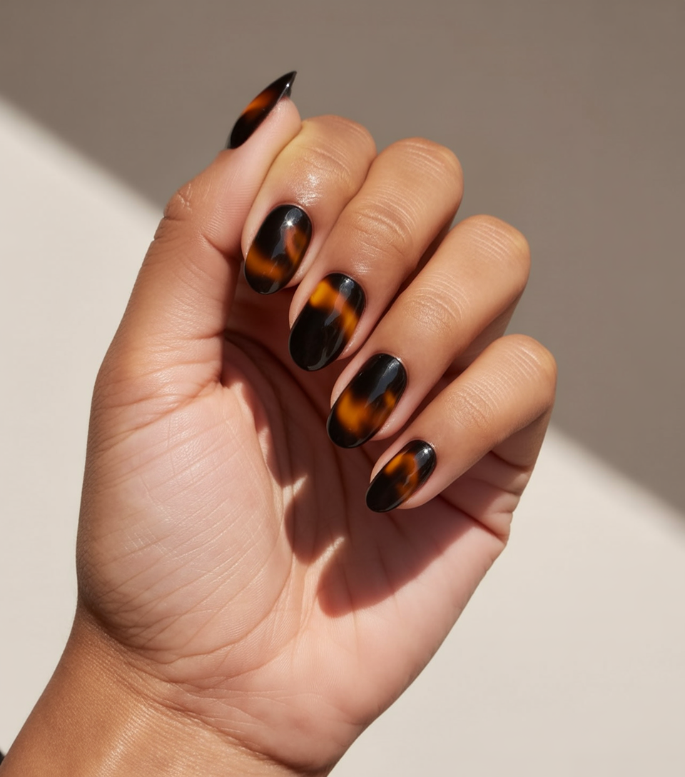 Dark, glossy, and rich with depth—such tortoise nails are sophisticated. Brown and black hues blur together like fine espresso, producing a high-gloss finish that’s powerful but feminine. They’re that kind of nails that will instantly turn a basic outfit more streamlined.