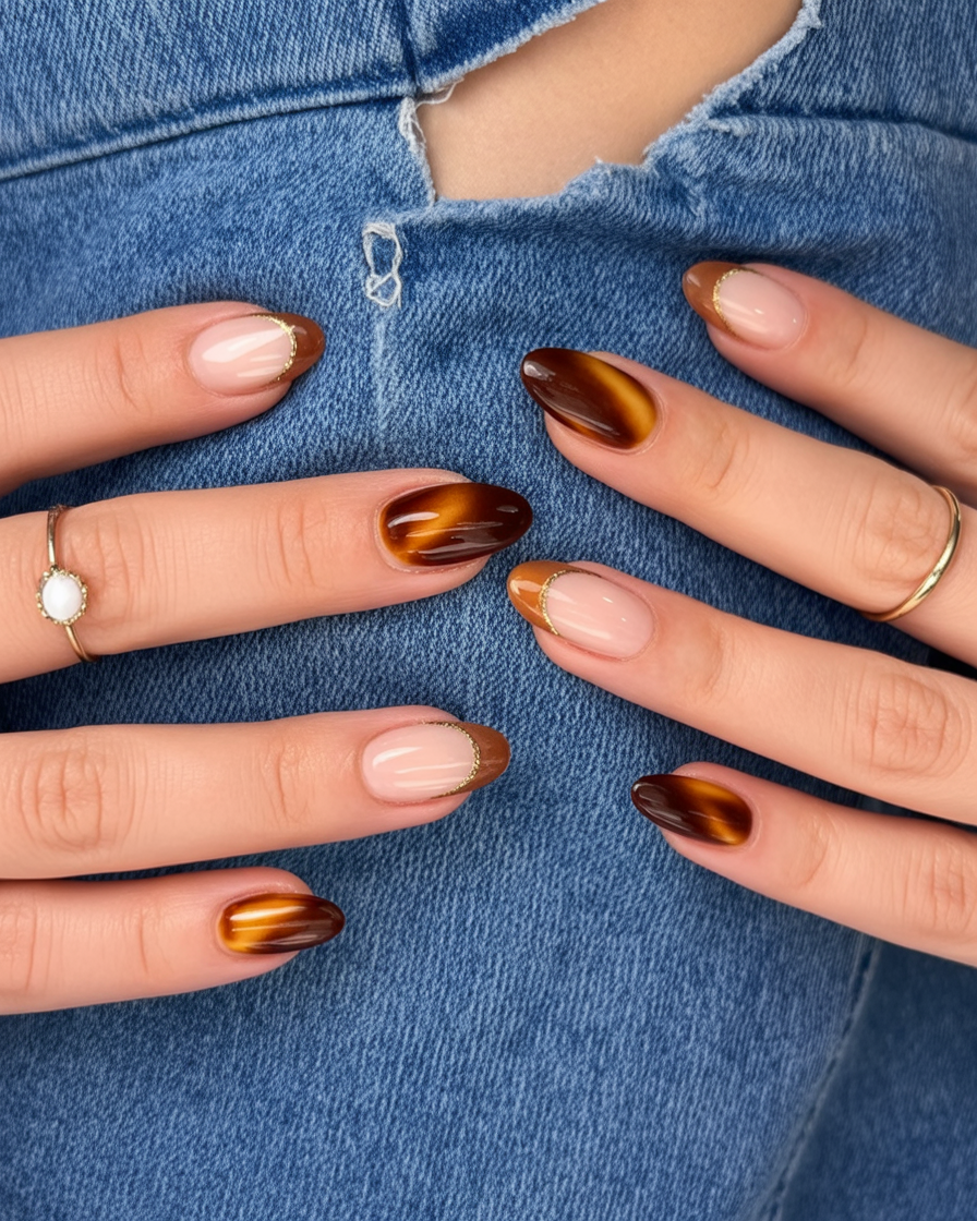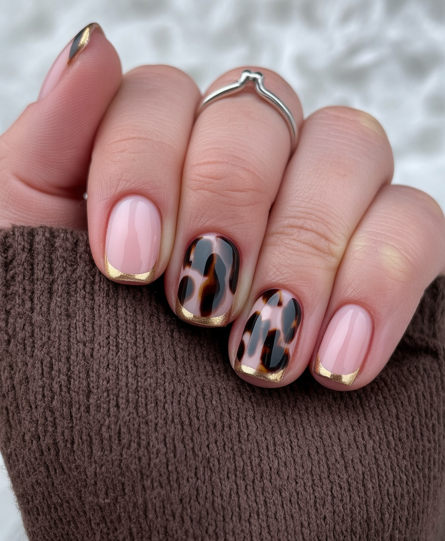 What makes this design special is its contrast: soft pink paired with warm brown and gold accents gives the nails a natural lift. Ideal for anyone looking to dip into the tortoise trend without going full coverage. It’s one of those ideas that transition perfectly from office to evening—classy, current, and quietly bold.