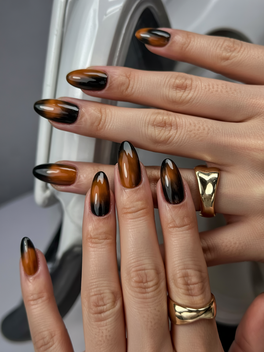 There’s a hint of drama to these smoky tortoise nails—a gradient fade from amber to black that’s mysterious yet sophisticated. They possess that deep, layered quality you’d find in thick resin or marble paintings. The glass finish sets them apart, but the gradient injects a sense of creativity.