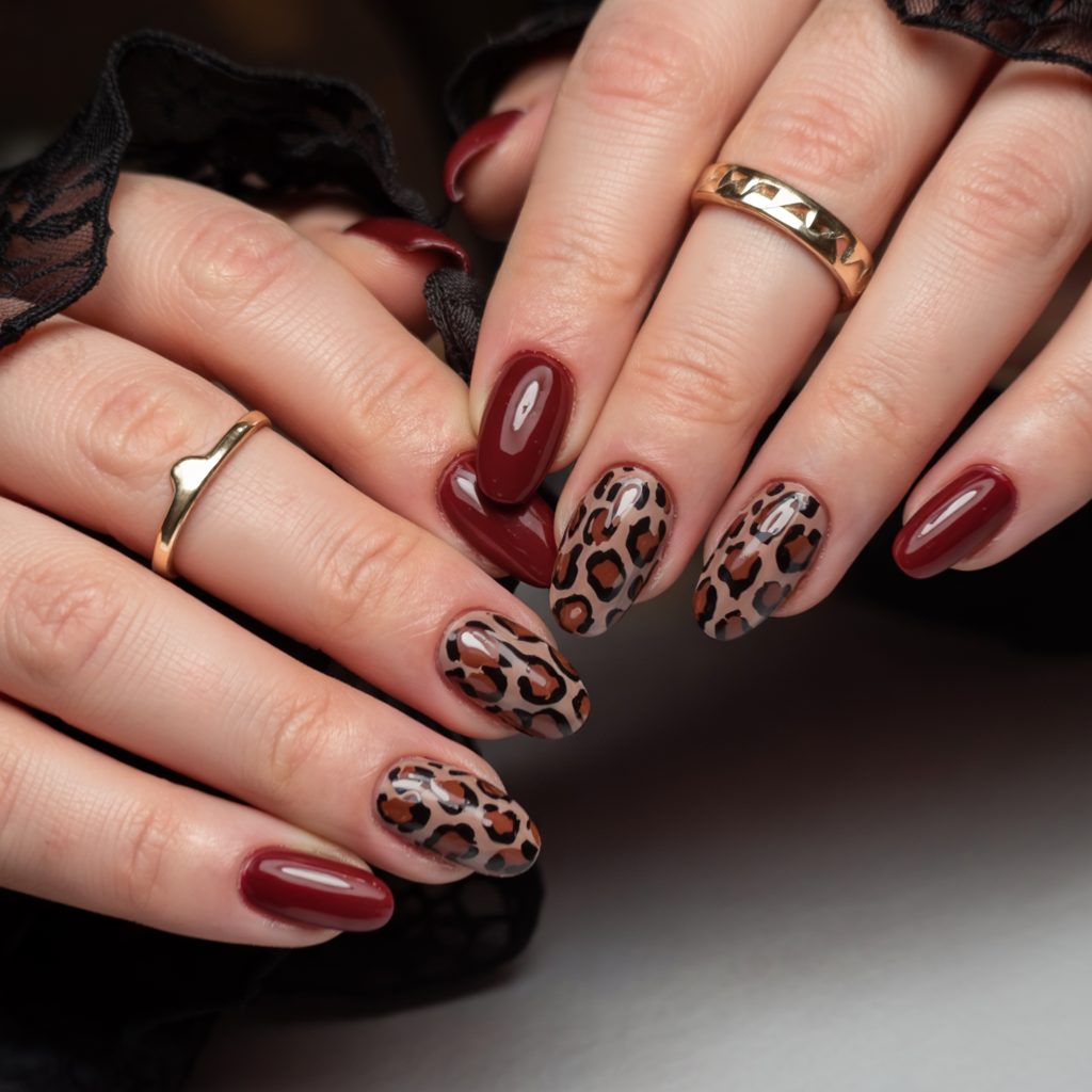For a look that’s sophisticated yet fearless, this dark red and leopard-print tortoise-print nail design hits just the right note. The glossy burgundy adds drama and dynamism, while the leopard print-inspired painting adds a free-spirited, fearless zest. It’s just a wonderful mixture of sexy and sophisticated, a look that catches attention but subtly exerts it.