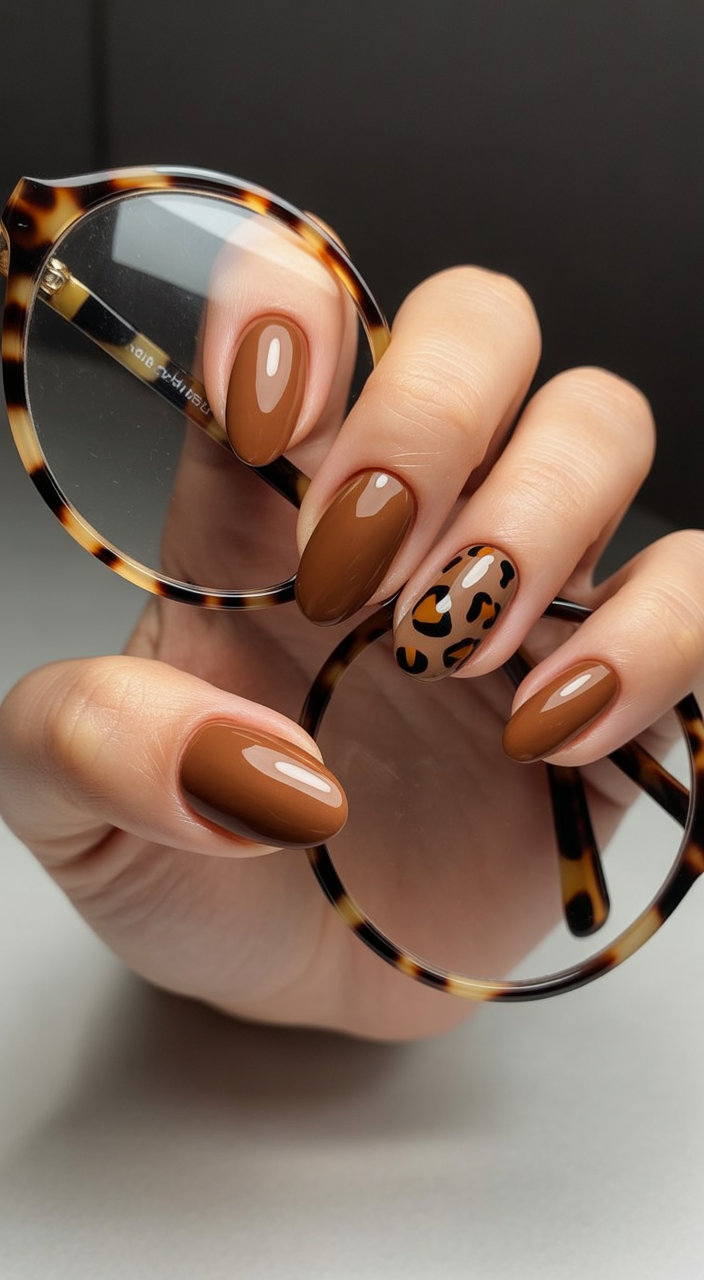 This manicure exudes easy sophistication—rich brown nails with a single tortoise accent for that hint of subdued opulence. It’s a look that feels contemporary but classic, such as a cashmere sweater with designer sunglasses on a fresh autumn day. There’s just something about that high-gloss sheen and contrast that says sophistication in a whispered tone.