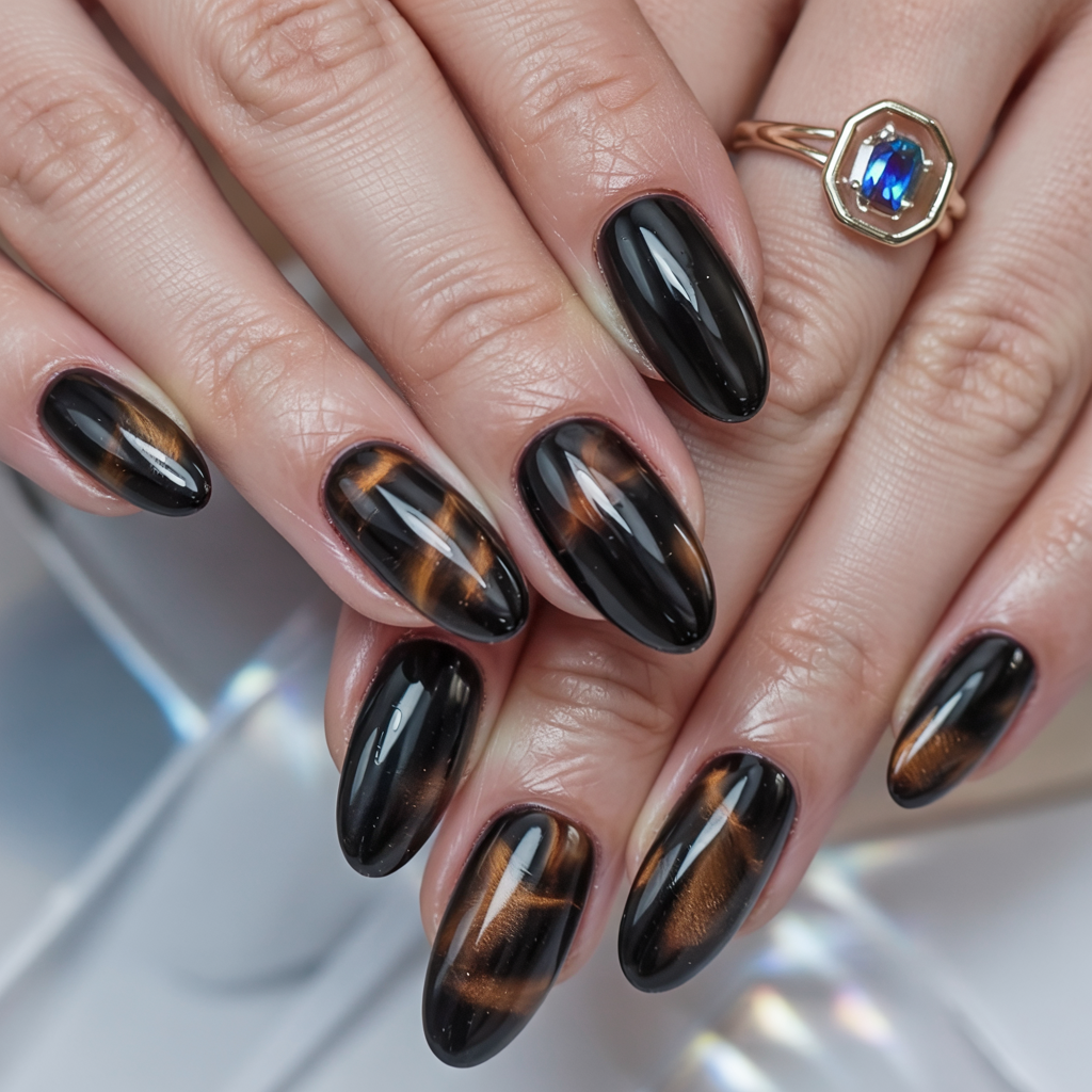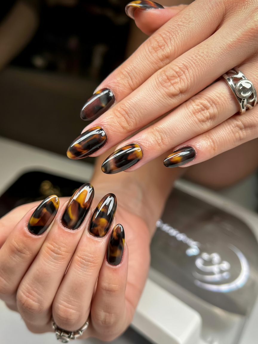 A deeper, darker take on the tortoise trend—this version leans into black and amber tones for a moody yet luxurious effect. The glossy surface catches the light in just the right way, giving the illusion of melted glass. It’s elegant but with a mysterious edge—like a velvet dress in nail form.