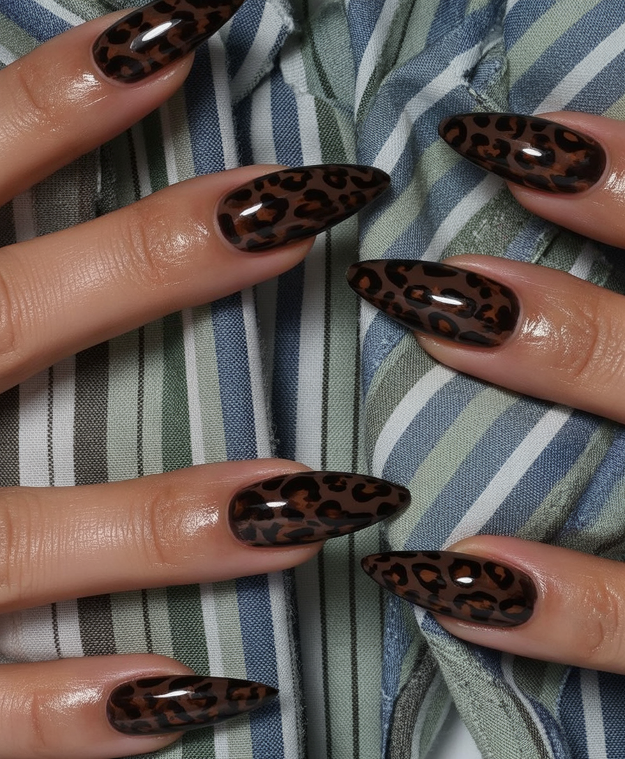 Get totally exotic with this dramatic leopard-inspired tortoiseshell. The high-gloss finish and dark brown contrast create a bold sophistication that’s more runway than jungle. They’re the sort of nails that make you reach for red lip color and your go-with-everything statement ring. This one’s for women who aren’t afraid to stand out. The pointed almond shape adds drama, while the mix of brown and black shades keeps it wearable. It’s a perfect balance of colorful art and classic tones—ideal for nights out or when you just want to feel unstoppable.