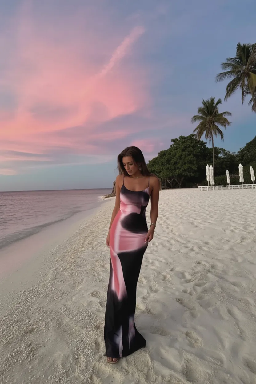 This Long flowing maxi dress feels like a sunset captured in fabric—soft blends of color that shift with every step. It has that quiet, cinematic beauty that makes even a simple walk feel like a scene from a movie. There’s something deeply calming and elegant about this silhouette, especially when paired with an open sky and warm evening air.