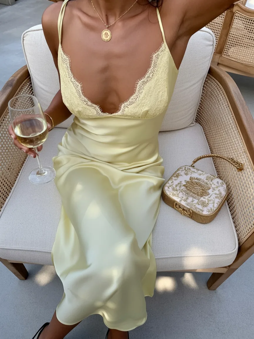 This Butter yellow satin slip dress feels like quiet luxury on a warm summer afternoon. The silky texture catches the light in the most flattering way, giving off that soft glow that feels both relaxed and refined. It’s the kind of look that doesn’t shout for attention but still turns heads effortlessly.