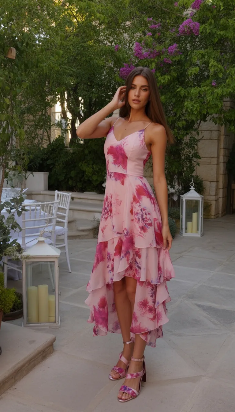 There’s something effortlessly dreamy about a soft Pink floral midi that moves with you like a summer breeze. This look feels like a quiet garden party moment — a little romantic, a little nostalgic, and completely feminine without trying too hard. The layered hem adds just enough drama to make you feel special, even if you’re just heading to brunch or a casual outdoor dinner.