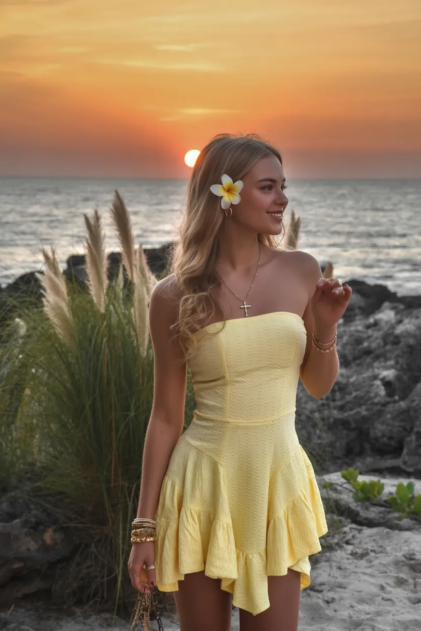 This look feels like effortless elegance with a hint of vacation charm. The soft neutral tone combined with delicate ruffles creates a relaxed yet feminine vibe that’s hard to ignore. It’s the kind of dress you slip into when you want to feel put-together without overthinking it—easy, breezy, and quietly confident.