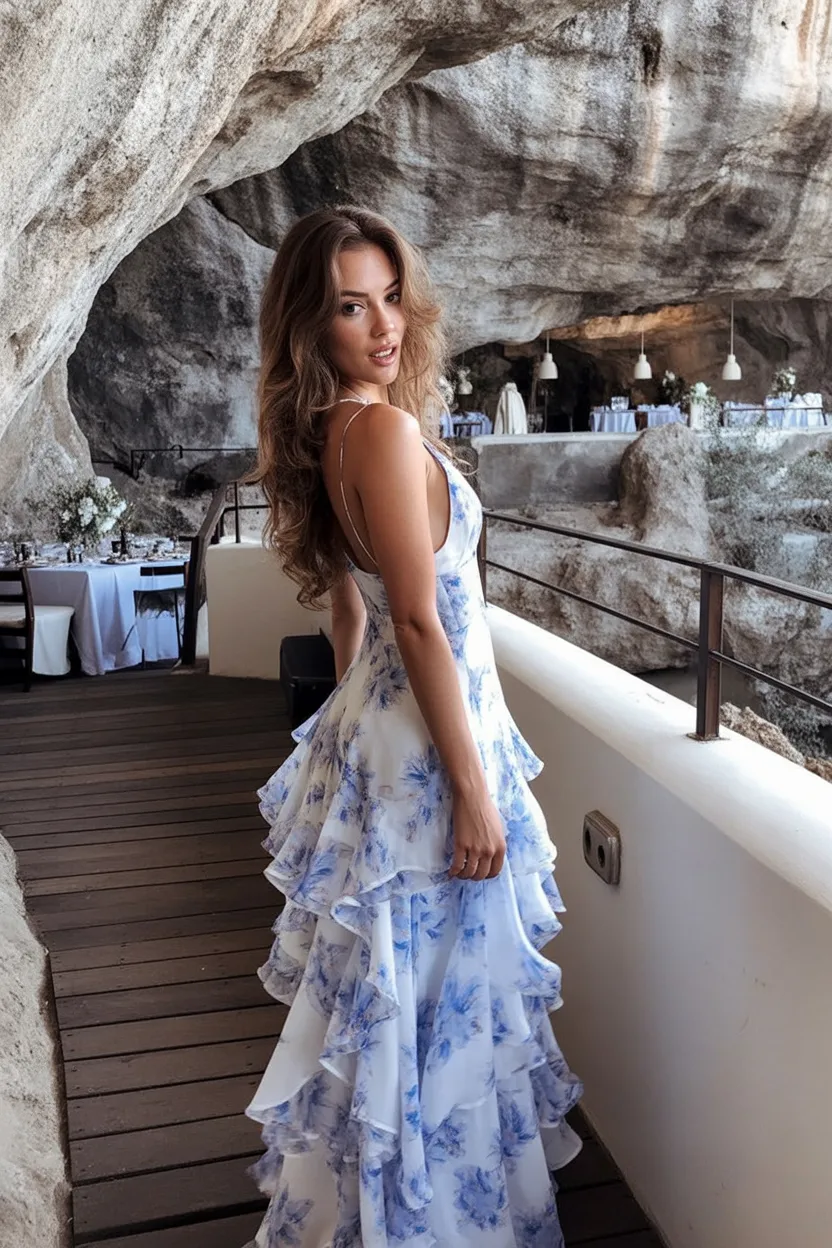 There’s a soft, romantic energy in this Blue layered maxi that feels almost cinematic. The cascading tiers move beautifully with every step, giving the entire look a sense of lightness and grace. It feels like something you’d wear to a special dinner or a destination celebration where you want to feel just a little extra.