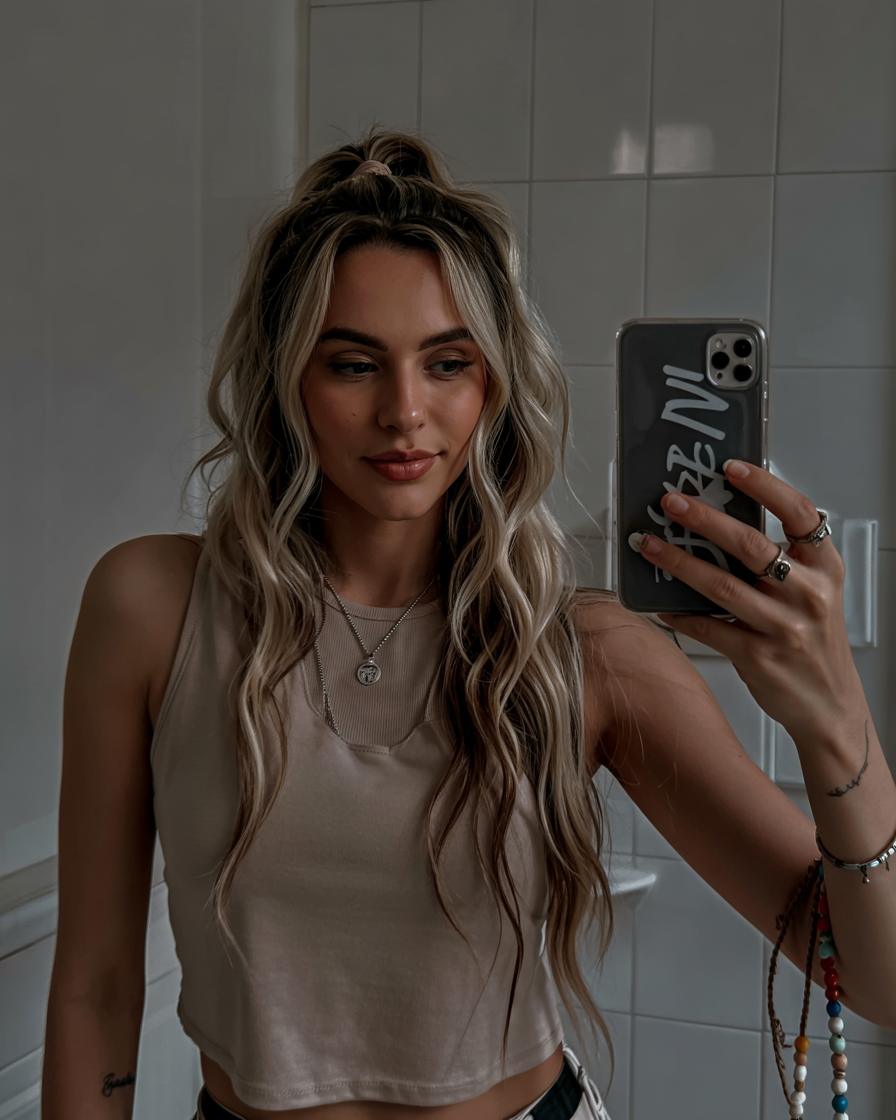 It is this relaxed half-up look that is essential on the cozy winter mornings and coffee runs. This is a carefree, easy going look, with a sort of messy hair, with just a high pony braid on the top of the head, and a cool beauty with the slightest touch of sloppy braids that is easily chic. Playful and modern yet never going it too big– like your hair just gets you.