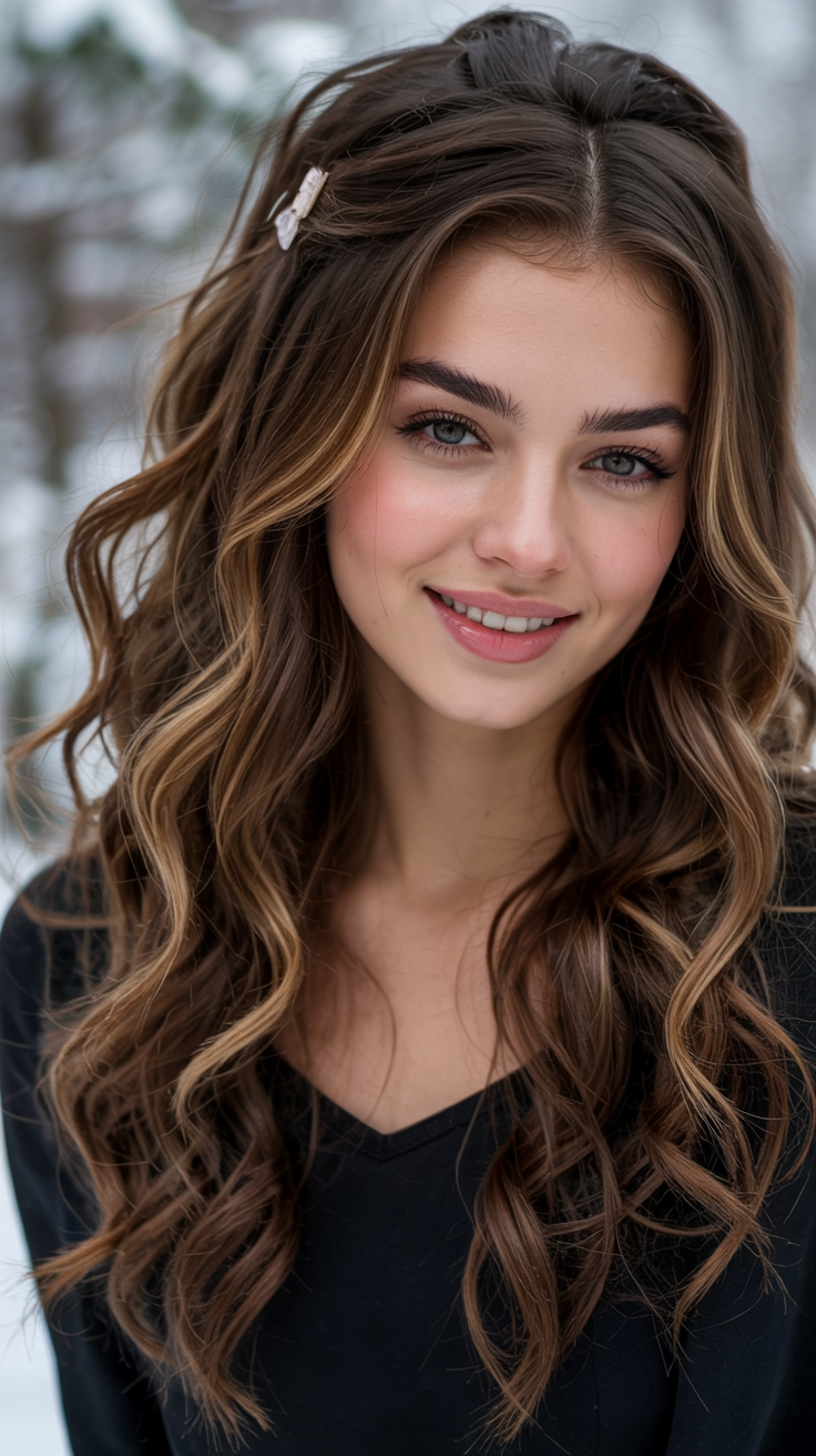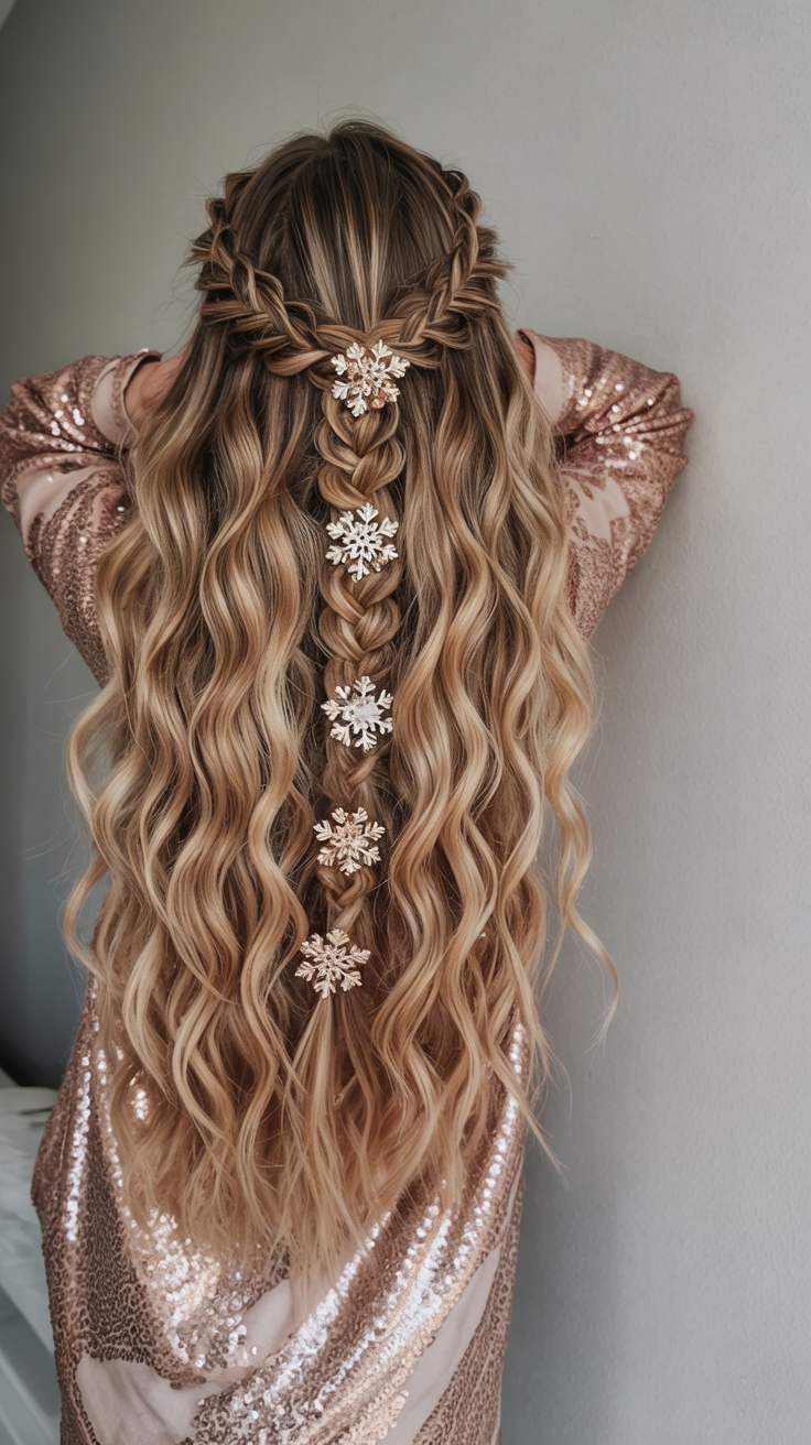 Something so magical about this winter braid comes to your mind that immediately takes you back to a snowy night of glittering lights and celebrating warmth. The falling waves and flowing snowflake clips give the effect that is both pompous and playful- a Nordic fairytale brought to life. It is the sort of hairstyle and you would like to take mulled wine in a sequin wrap and spin under the light of fairy lights.