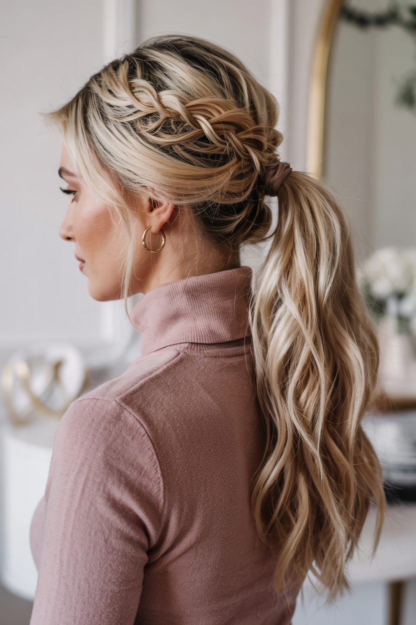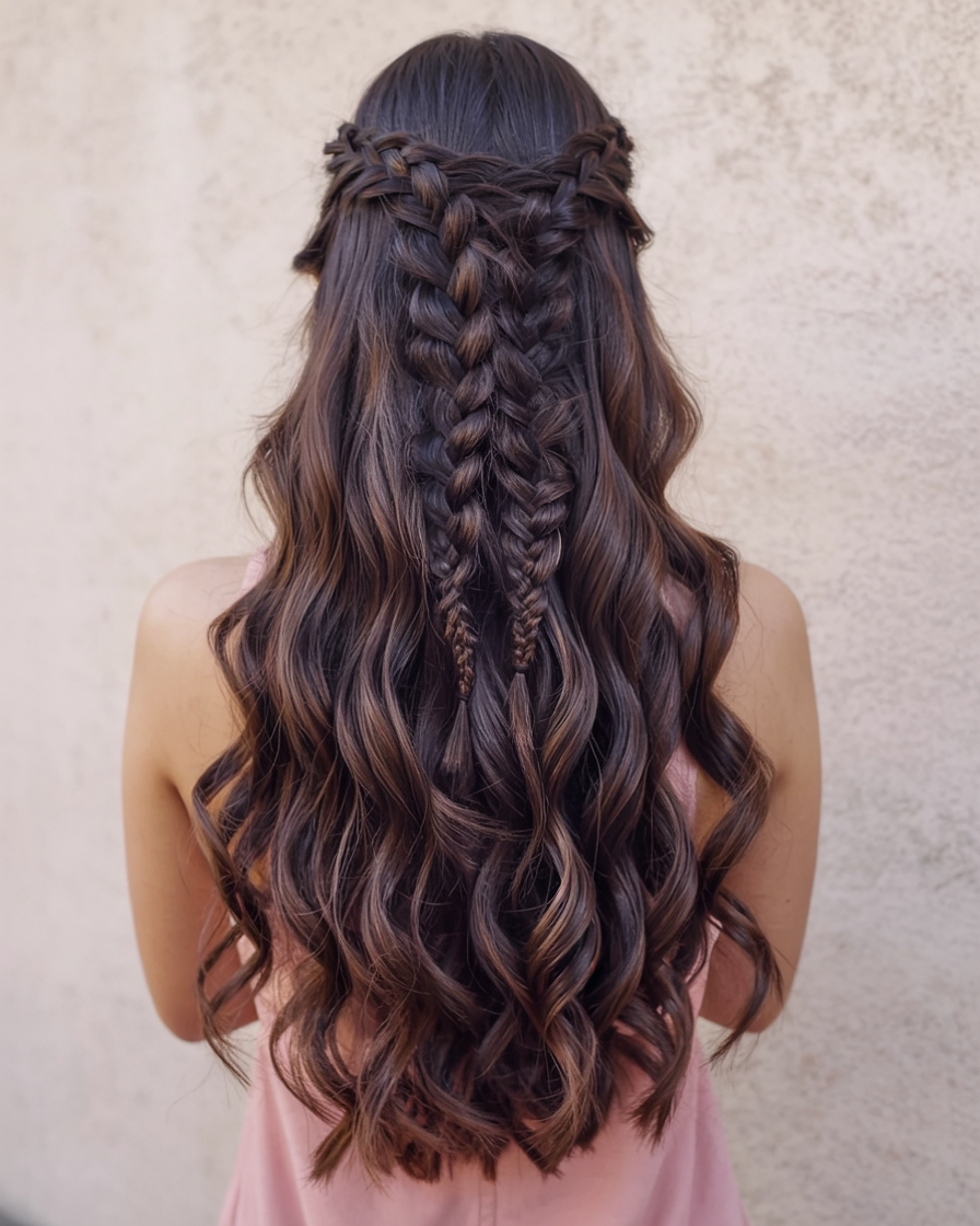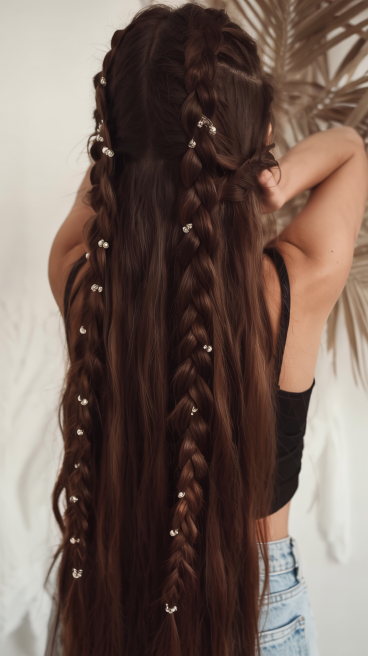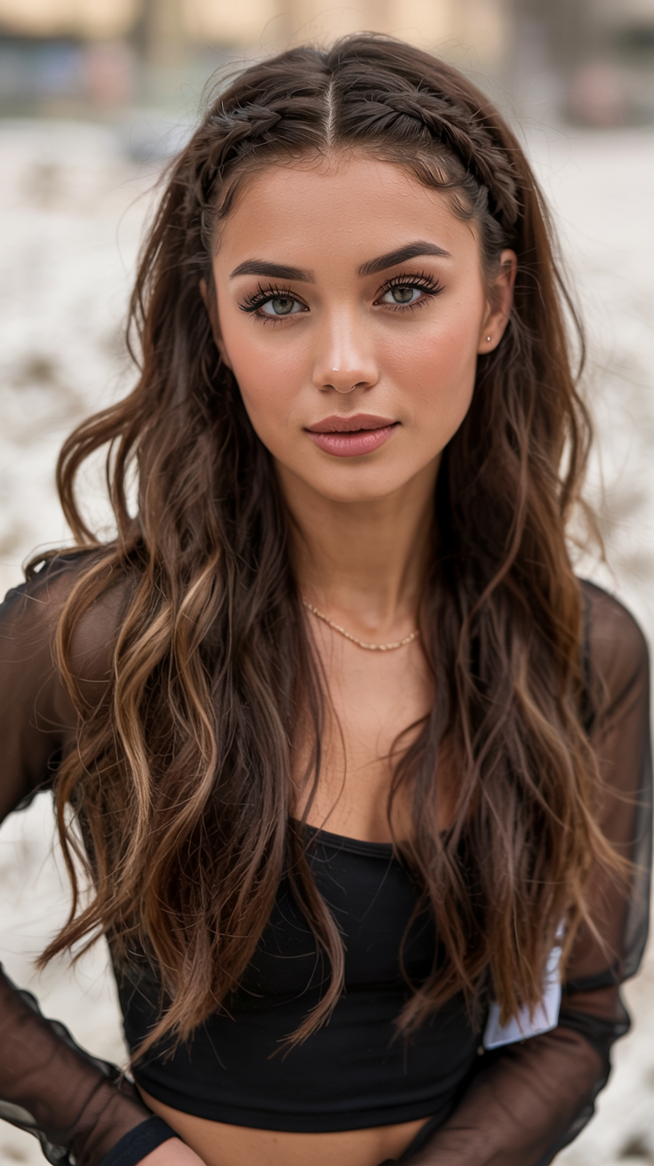 This is very attractive in long and thick hair- more so when you have a natural texture or soft waves. In order to replicate such a dreamy appearance, you should divide your hair into soft waves with a large-barrel curling wand and then weave the part in the center. The embellishments added are not only festive: the additional decorations serve to stabilize the braid and add glam to it. Ideal in winter weddings, holiday parties or anyone wanting to feel like the queen of the season.