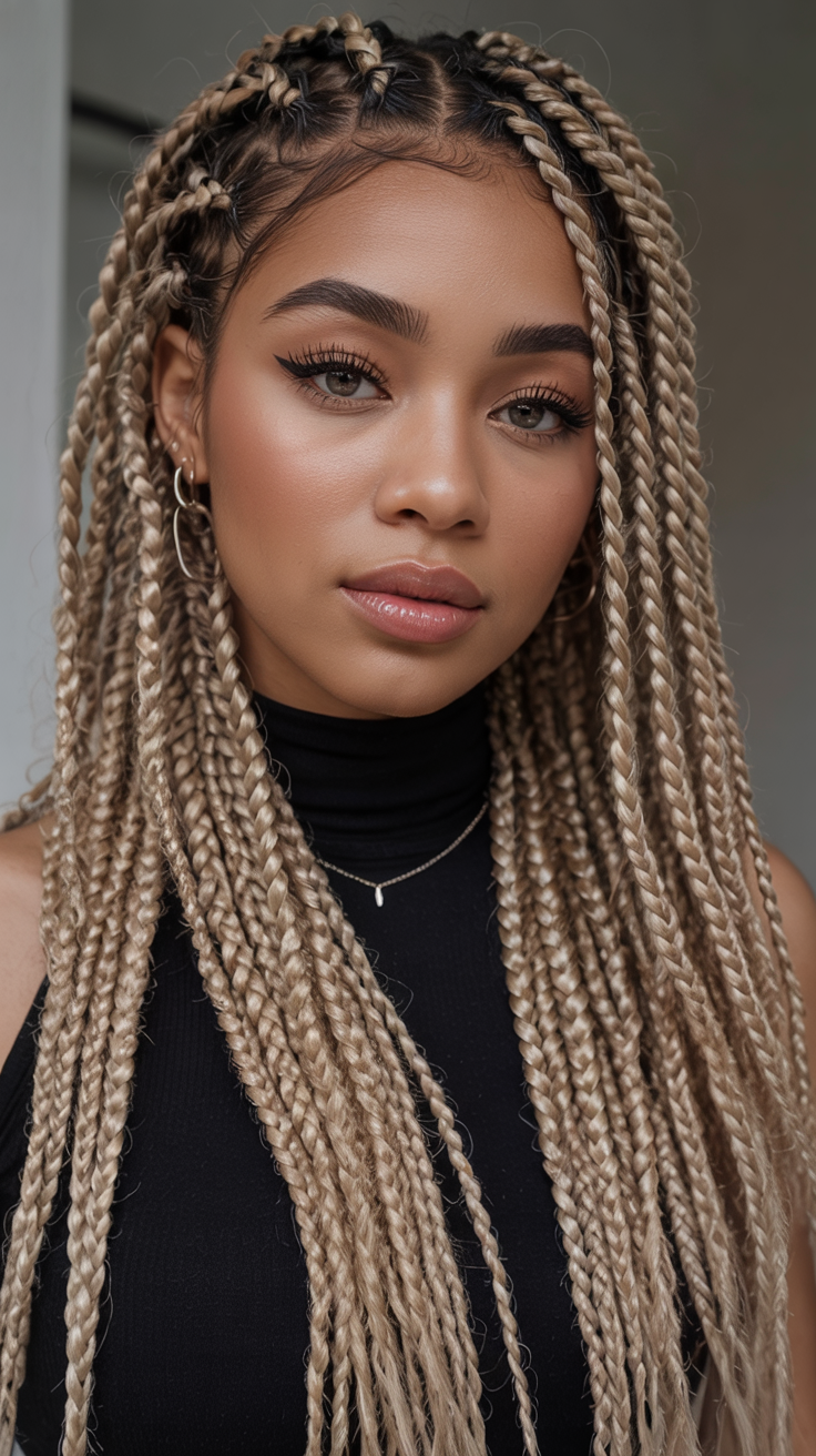 These are bold and bright golden blonde box braids that are winter sunshine. The cold feeling is an end on its own in the dark knit and long coats of this season, but the trimness of the braids gives it the finish. It is bold yet simple to wear – and completely captivating in the movements.