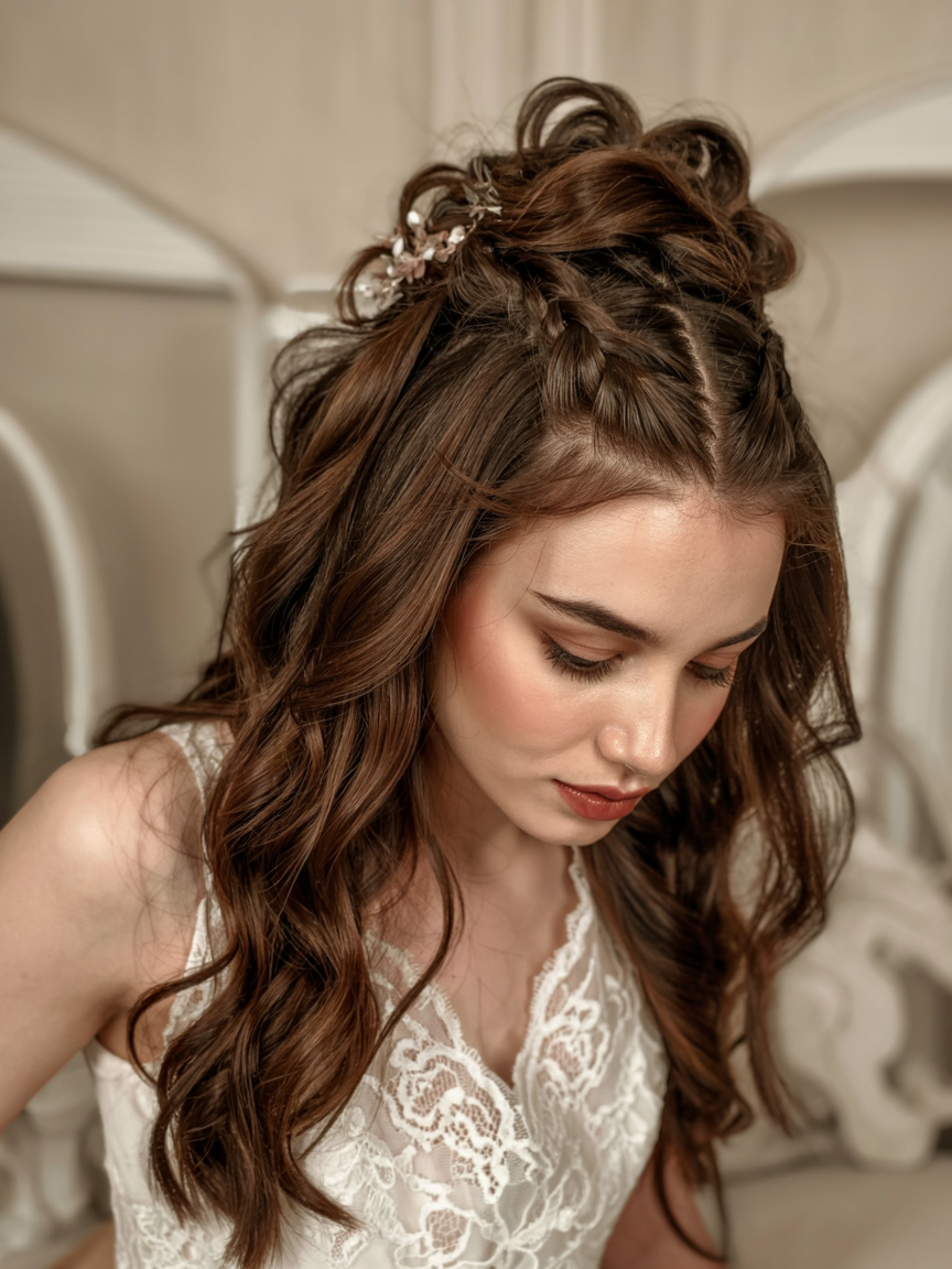 This is a very good style with medium and long hair having a slight wave or curl. The crown part is braided, which lifts the face and provides texture, whereas the looseness of the curls below provides volume. Cabbage a hair accessory or clip to make it even more glamorous. It is one of those fashions which suits well round and heart-shaped faces, giving them height and movement at the top.