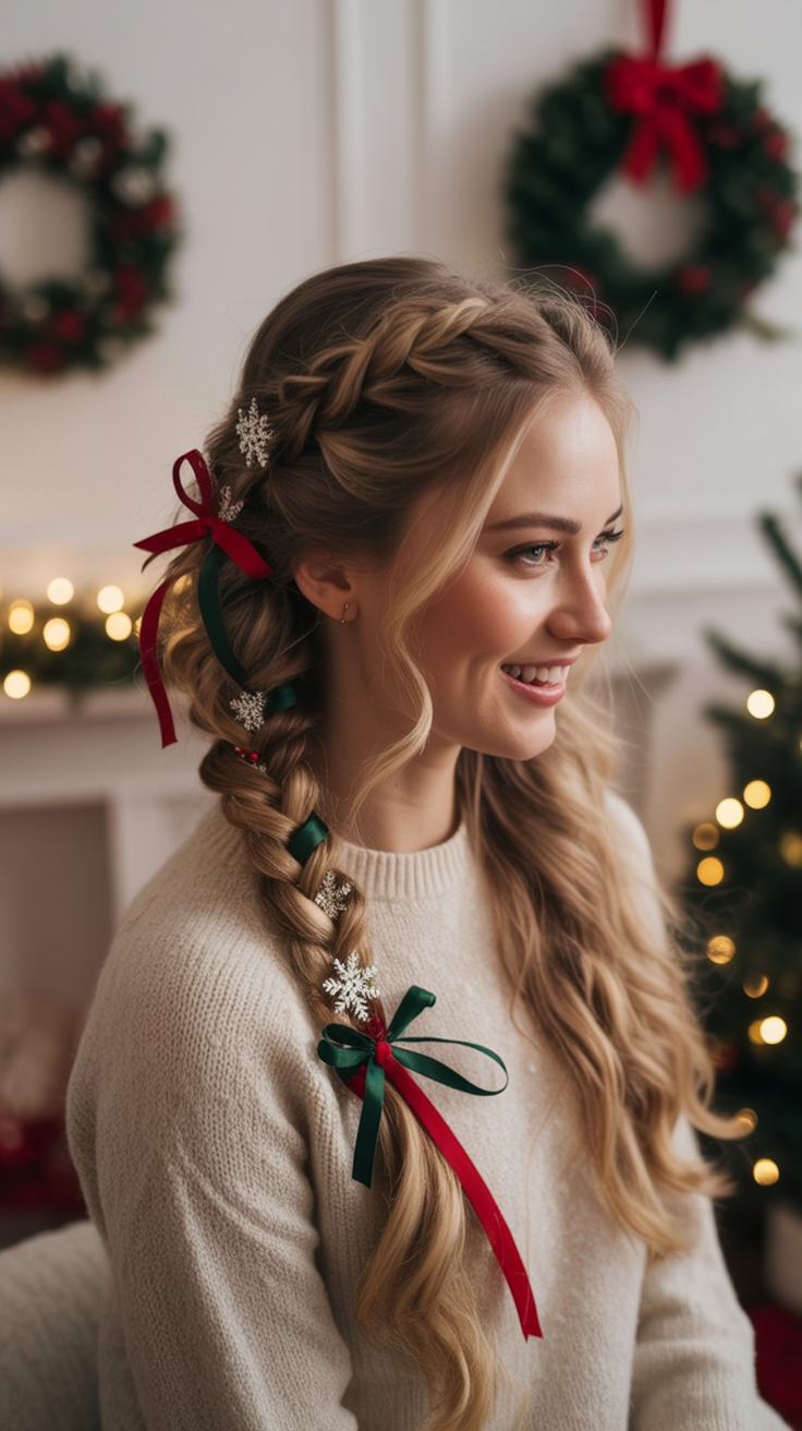 This gaily appearance virtually rings with cheerfulness. A side braid that is loosely tied and decorated with velvet red and green ribbons with sprinkling snowflakes-dotted hairstyle- this is a walking holiday card. It is lively and playful like a Christmas time mood but seems nice enough to attend a big dinner or holiday party in the workplace.