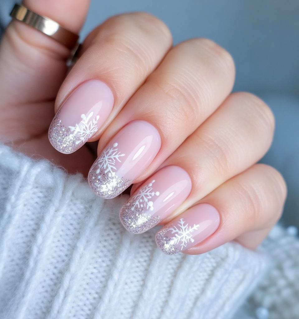 Nothing says winter wonderland quite like delicate white snowflake designs. Paired with glittered tips over a sheer pink base, these nails look like freshly fallen snow sparkling under the morning sun. They carry a playful yet elegant vibe that instantly lifts your mood when you catch a glimpse of them.