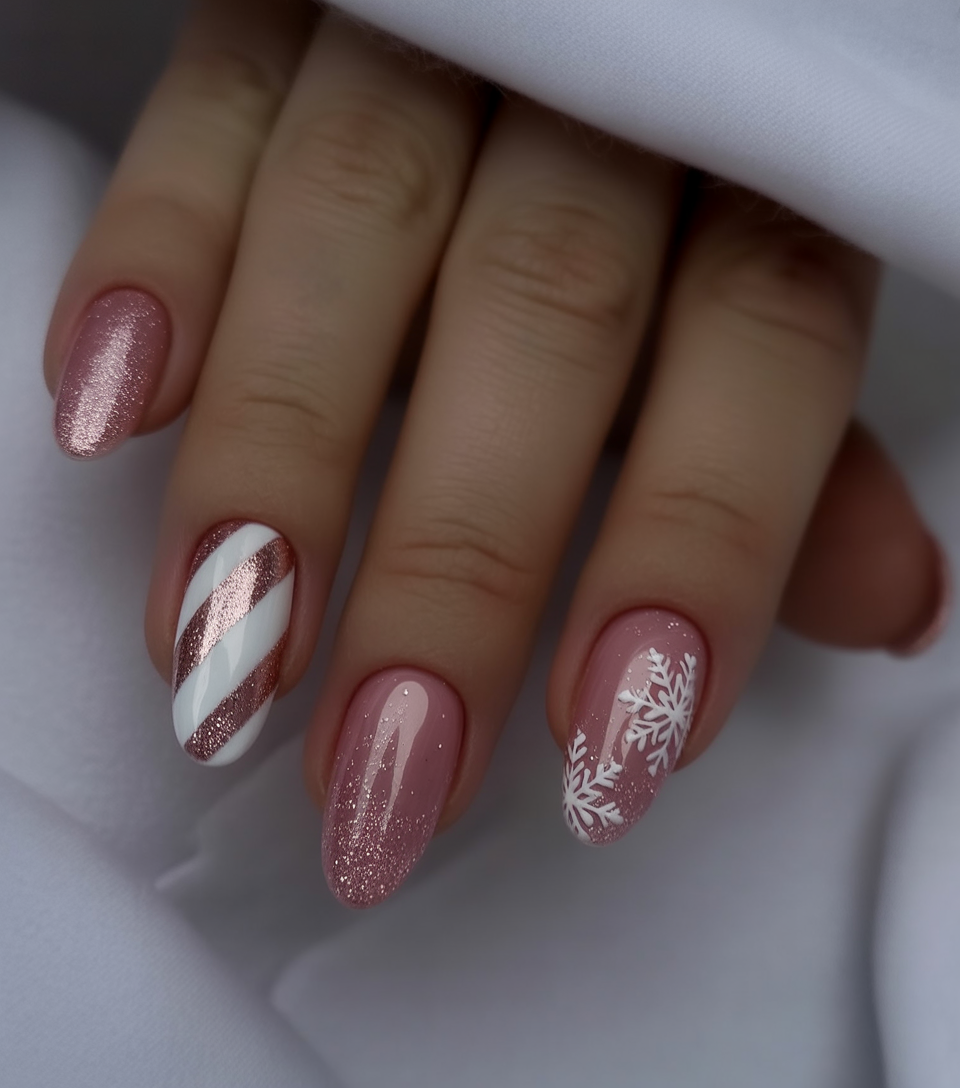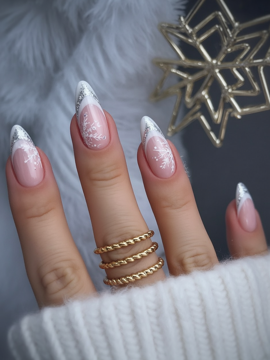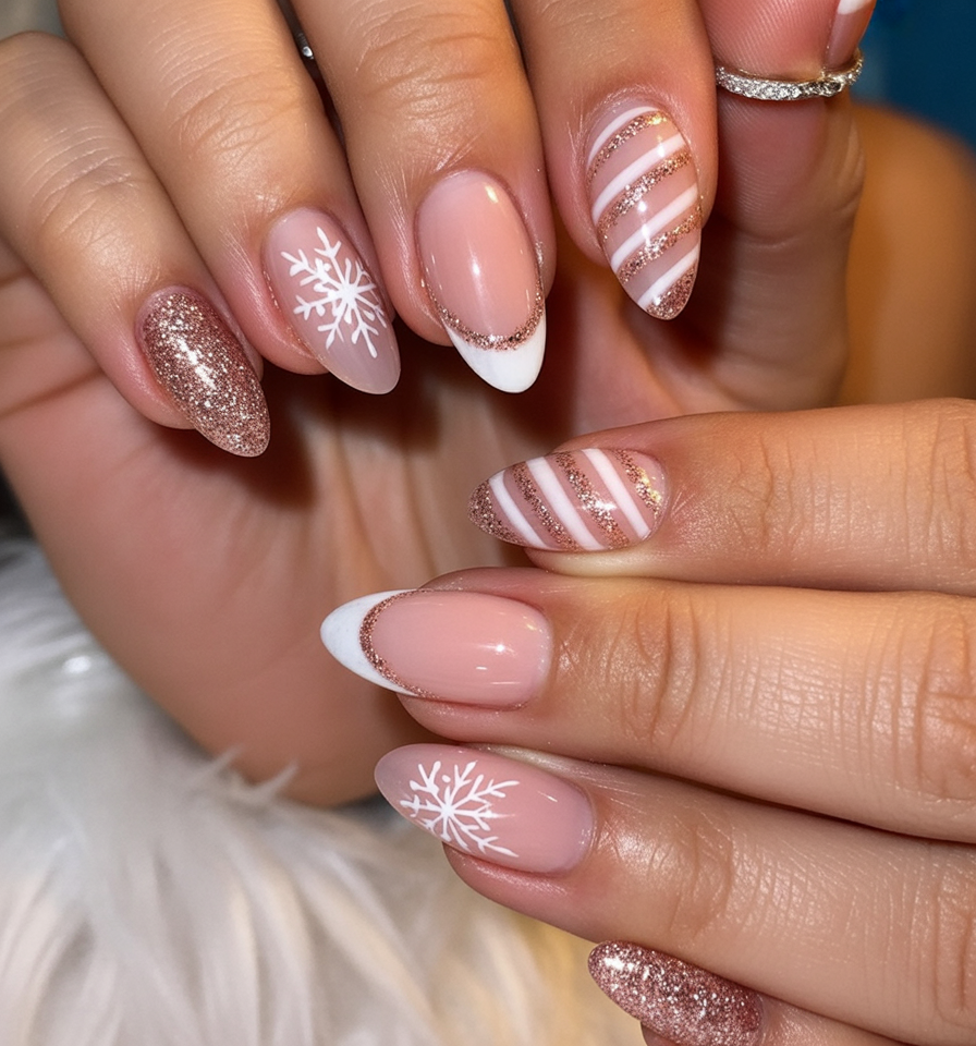These nails combine French tip elegance with playful winter details—sparkly stripes, delicate snowflakes, and rose-gold glitter. They feel joyful and whimsical, but the almond shape keeps them looking polished. It’s like wearing a holiday sweater, only more glamorous.