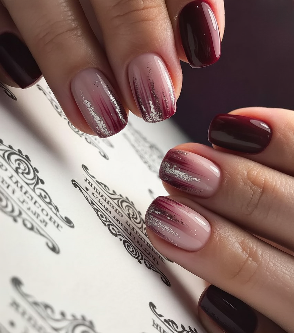 Rich burgundy paired with soft blush and streaks of silver glitter creates a nail design that feels both dramatic and elegant. The dark shades bring depth, while the sparkle keeps it lively and festive. It’s bold without being over the top, like a glass of red wine on a snowy evening.