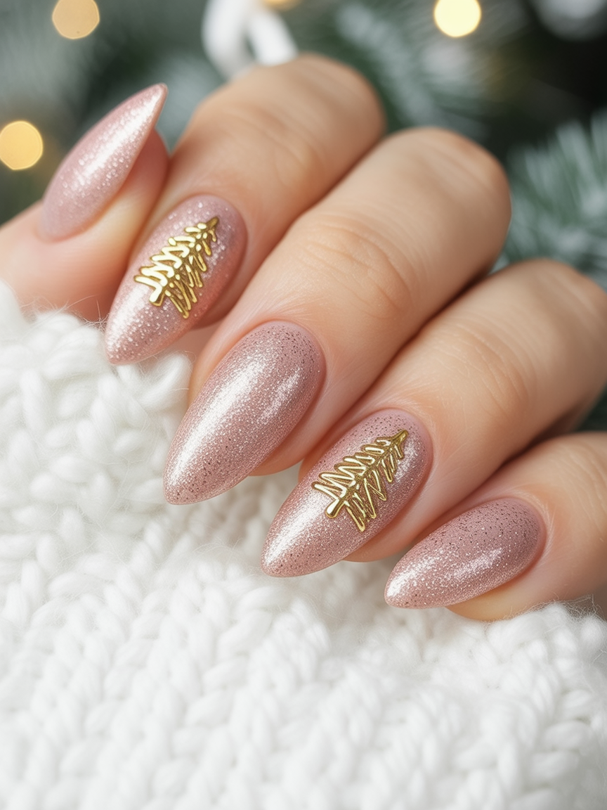 There’s something instantly joyful about a soft pink shimmer paired with a tiny golden tree—like ornaments on fresh snow. The glow reads elegant rather than loud, with just enough glitter to catch the twinkle lights and flatter every skin tone. On an almond shape, the silhouette feels feminine and classy, and the warm sheen keeps it from leaning too frosty. It’s the kind of manicure that makes even a grocery run feel a little more festive and cute.