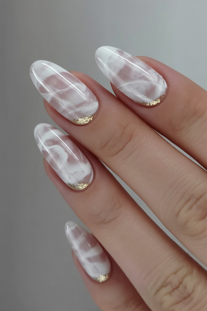 Think of these as winter clouds captured on your fingertips—soft white marble veining floating over a sheer base, kissed with a hairline curve of gold at the smile line. The effect is elegant and airy, a sophisticated nod to ice without going full ice blue. On an almond shape, the look elongates the hand and feels luxe but understated; it’s the manicure that quietly says you notice the details.