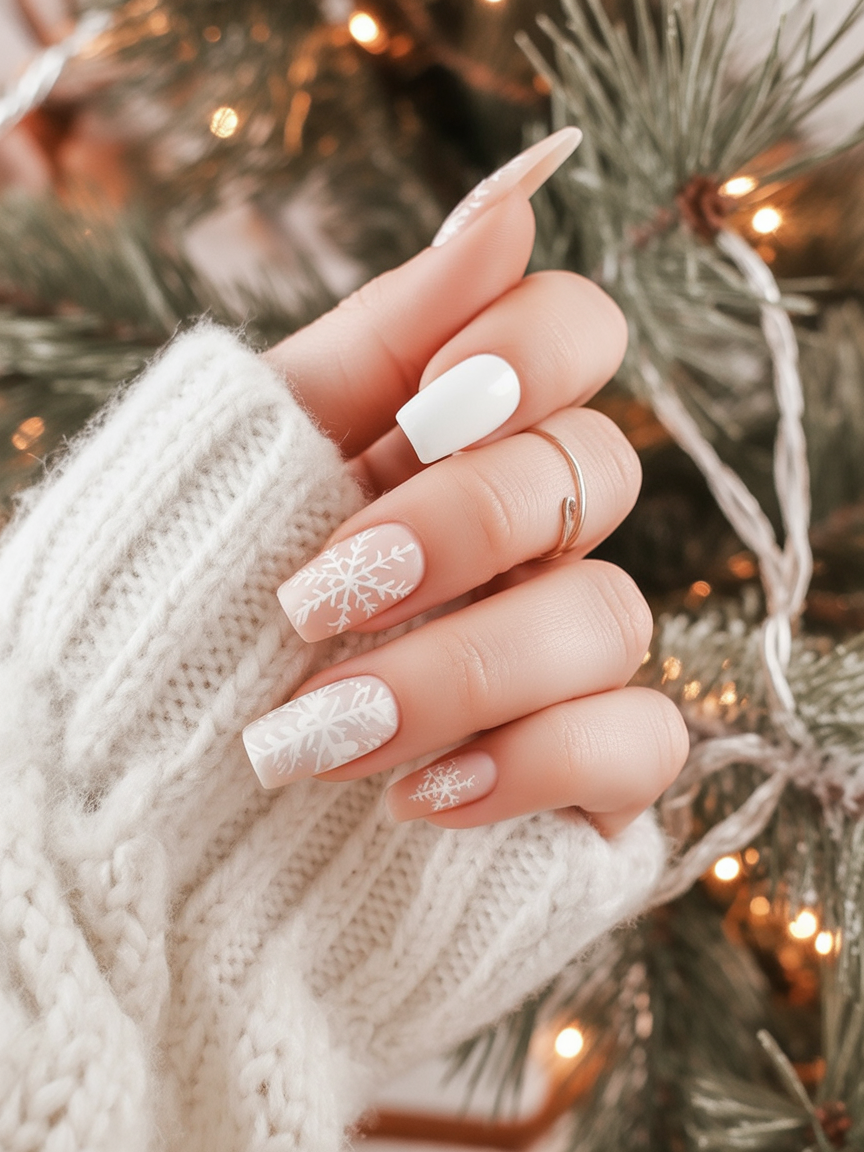 Low-maintenance angle: short square lengths are sturdy, easy, and ideal for busy weeks of cooking, wrapping, and traveling. A gel topcoat adds long-wear shine, and the mostly white design disguises minor scuffs. If you like a touch more drama, add a subtle French tip on one nail or a hint of glitter at the cuticle. This is a simple choice that still feels special—perfect for anyone who wants seasonal nails without high upkeep.