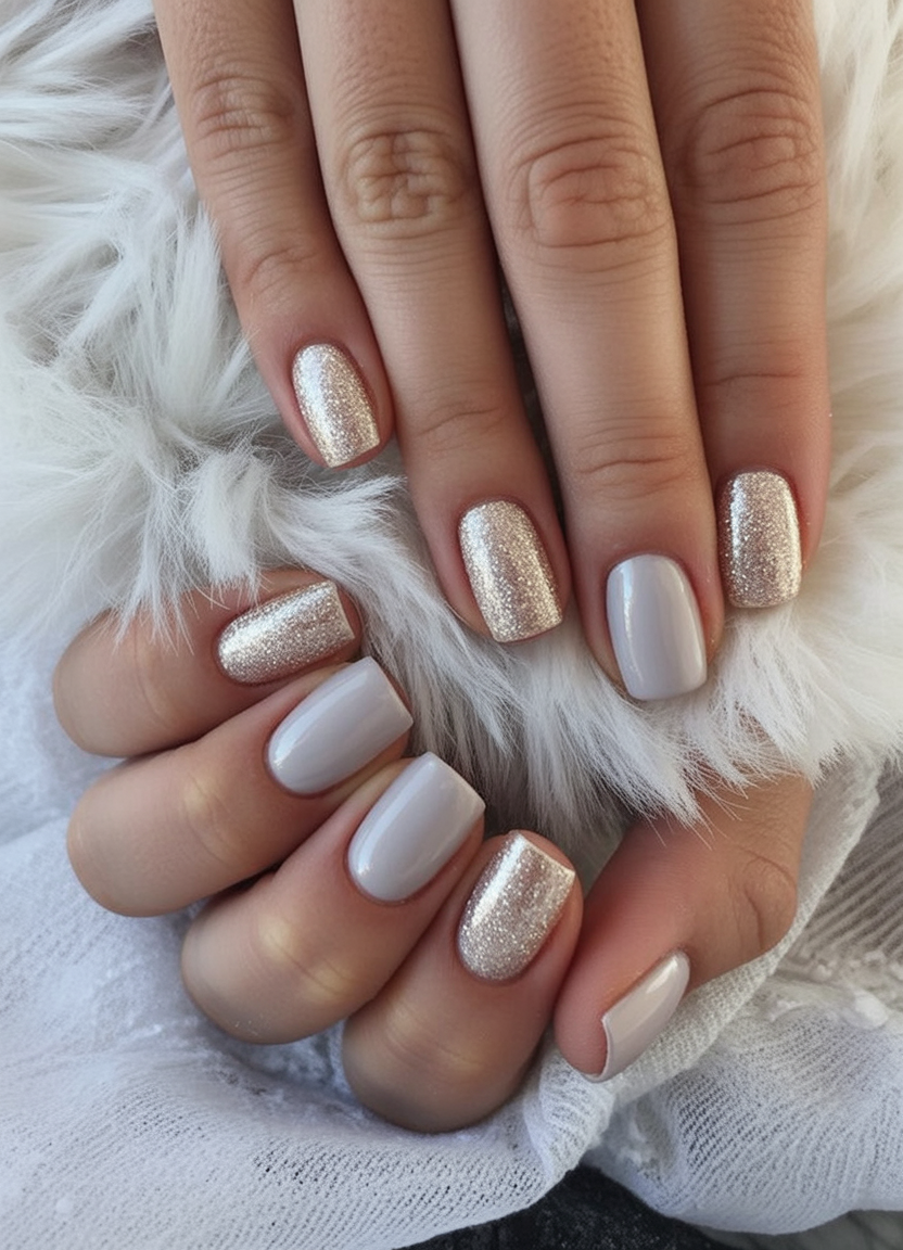 This manicure mixes quiet sophistication with a hint of celebration. Soft beige nails alternate with glittery champagne accents, creating a balance that’s classy yet playful. The short square shape feels fresh and easy, making it a perfect everyday winter look that still sparkles at dinner parties. It’s the kind of set that whispers chic instead of shouting, and that makes it so wearable.