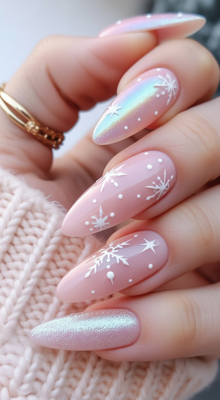 Current trends: iridescent holographic finishes are big for winter 2025, and this look blends that with timeless snowflake motifs. Perfect on gel or acrylic almond, this design lets you experiment with color play while keeping it feminine. Pair with silver jewelry or a light pink sweater to let the rainbow shimmer really pop.