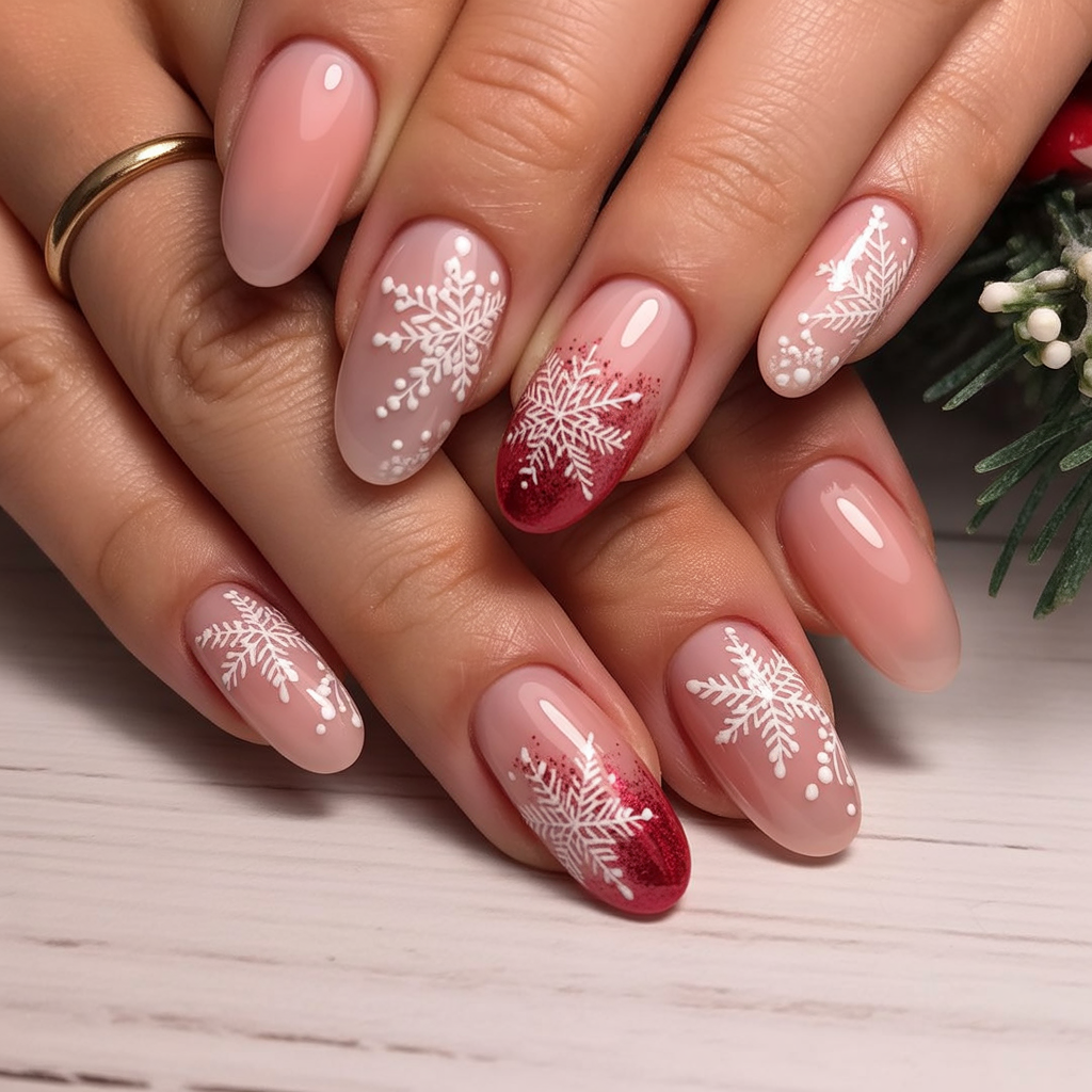 Few things say “holiday season” like the combination of crisp white snowflakes and a pop of red sparkle. Here, soft pink nails serve as the backdrop for delicate snowflake art, while one bold red accent creates instant drama. It’s fun, festive, and confident—a manicure that makes hot cocoa taste sweeter and parties feel more glamorous.