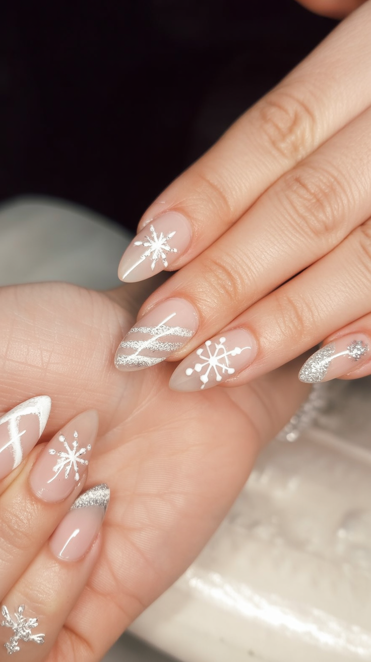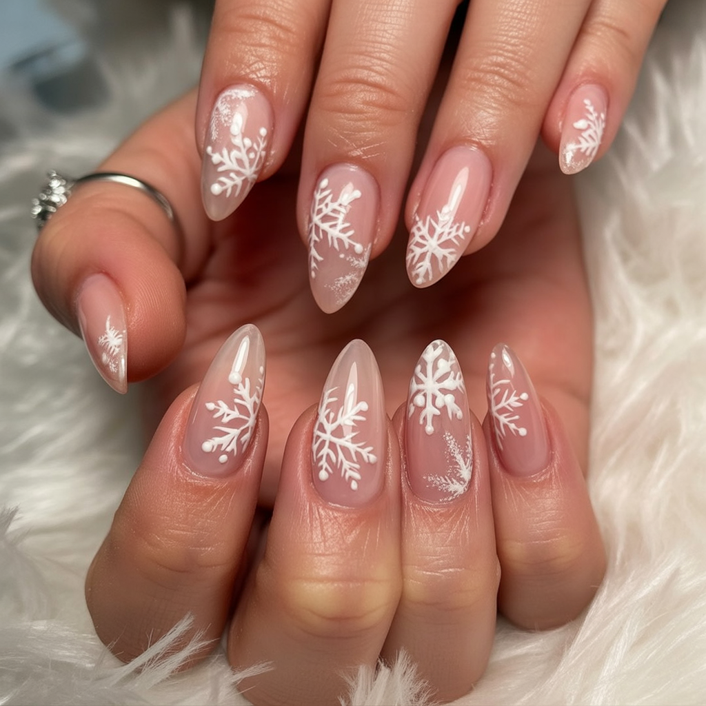 Delicate silver lines and snowflakes decorate these almond tips like intricate frost patterns. Each nail is a little different—one with diagonal shimmer, another with full snowflake art—creating a set that feels artistic and full of personality. The soft nude base keeps it grounded and easy to wear.