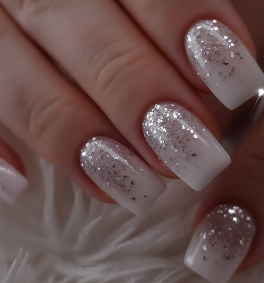 This set looks like fresh frost on a windowpane—soft gradient nude fading into icy silver glitter. The almond shape elongates the fingers, while the subtle sparkle feels elegant and timeless. It’s one of those designs that work for both everyday wear and dressy occasions without needing any tweaks.