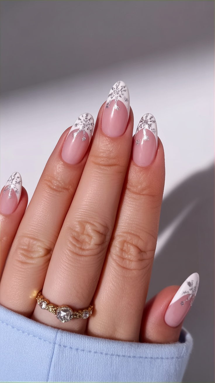 This design is pure winter sophistication. Soft pink nails with crisp white French tips get elevated with glittering silver snowflakes, creating a look that’s both classy and festive. They feel like a snowy morning walk—quiet, refreshing, and filled with sparkle.