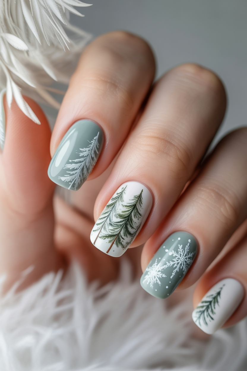 Styling tips: Choose a smooth gel application to keep the art crisp, and request short square edges for a simple, easy wear. A matte topcoat looks especially elegant on the sage nails, while a glossy seal on the accent nails keeps the snowflake details bright. This design pairs nicely with blue denim and ivory knits, and if you want a bit more sparkle, add a whisper of glitter at the cuticle on one nail only—just enough to catch candlelight without stealing the show.