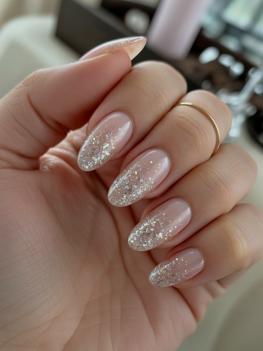 Comparison with other styles: unlike a full glitter nail that can sometimes feel heavy, the ombre keeps it airy and light. It’s more polished than a simple nude but less bold than a full metallic set. If you want your nails to glow quietly under candlelight, this one is a beautiful compromise.