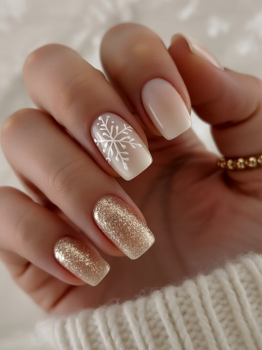 An ombré nude base topped with golden glitter feels like champagne bubbles frozen mid-pop. A single nail with a white snowflake makes the design extra seasonal without overloading the look. The square silhouette is modern and chic, perfect for women who love clean lines with a touch of sparkle.
