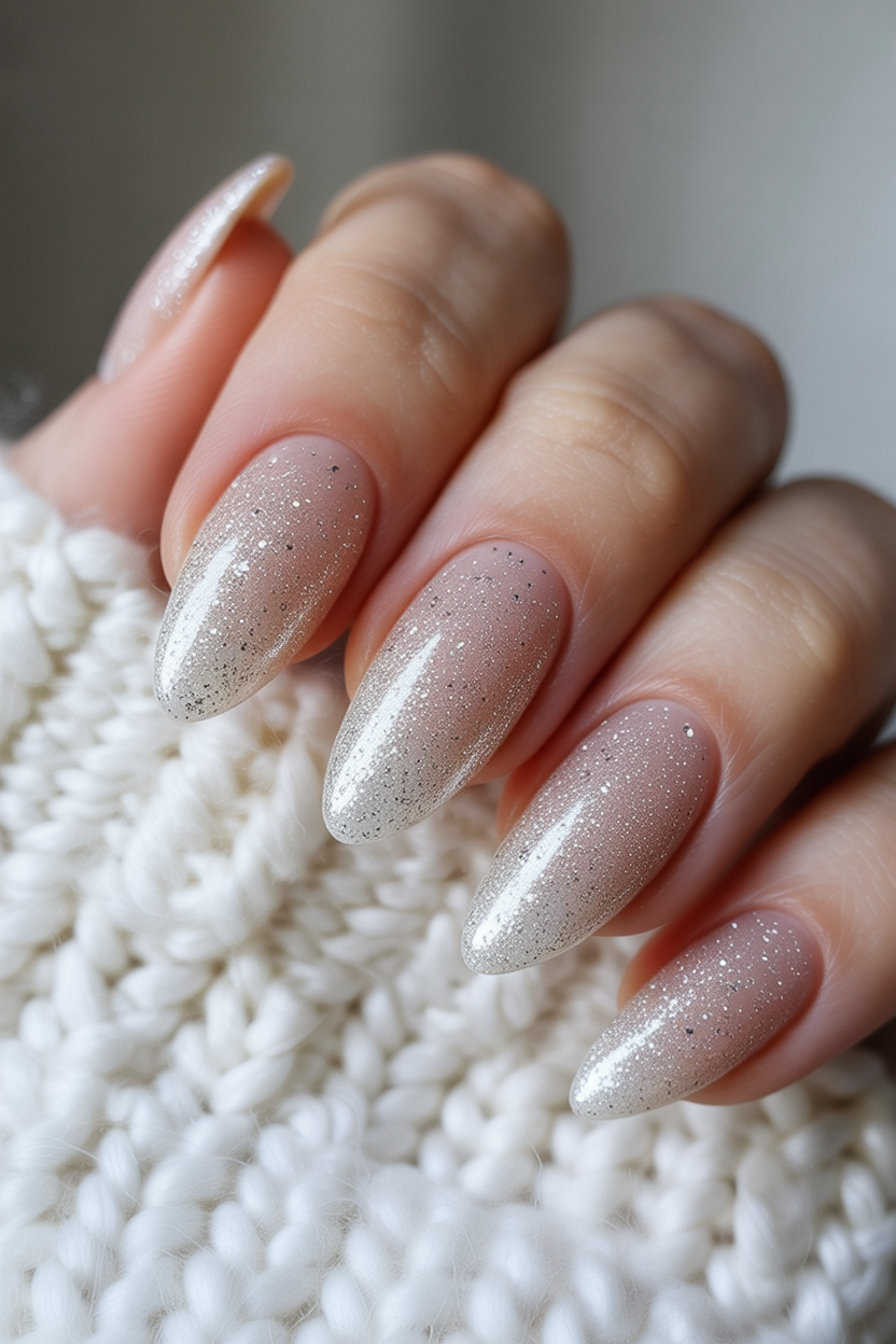 If your winter vibe is “glow, but make it effortless,” this sparkling gradient is your answer. A sheer nude base melts into champagne glitter at the tips, creating a soft snowfall effect that’s festive and classy without shouting. The almond silhouette keeps everything graceful, and the twinkle flatters rings and glasses alike—from latte cups to stemware.