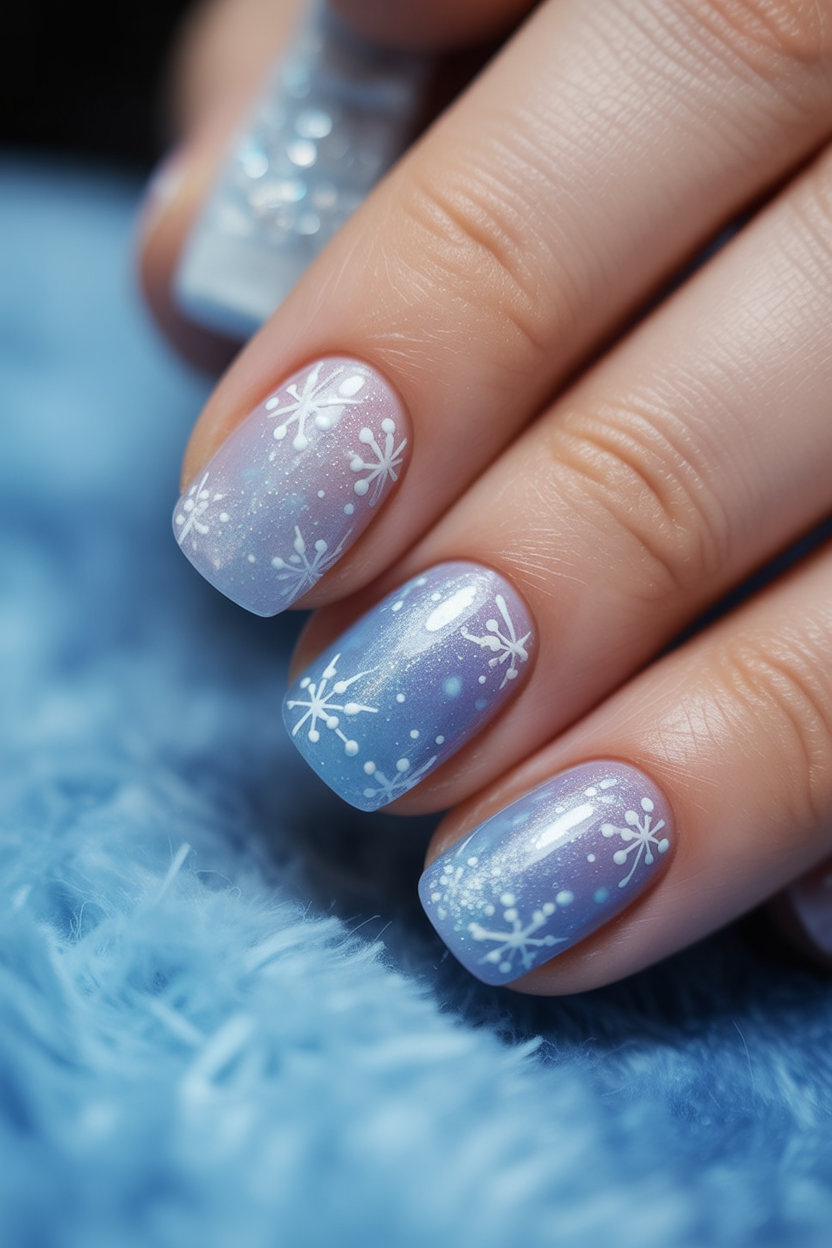 Like the soft glow of twilight on fresh snow, these short nails capture winter’s cool charm in ice blue tones. The gradient blue polish sparkles with delicate white snowflakes, giving off a playful yet refined seasonal vibe. It’s the kind of manicure that makes you want to wrap up in a fluffy scarf and embrace the magic of chilly days.